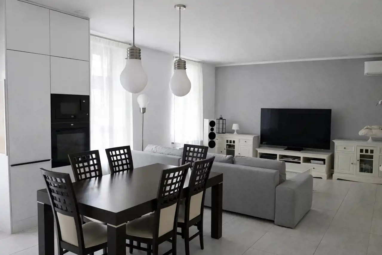 Kuchnia z salonem (41,8 m²) – przestronna, otwarta strefa dzienna z kuchnią w zabudowie (odnowioną w 2019 r.) i kompletnym sprzętem AGD: zmywarka, płyta indukcyjna, piekarnik, mikrofalówka, okap, lodówka