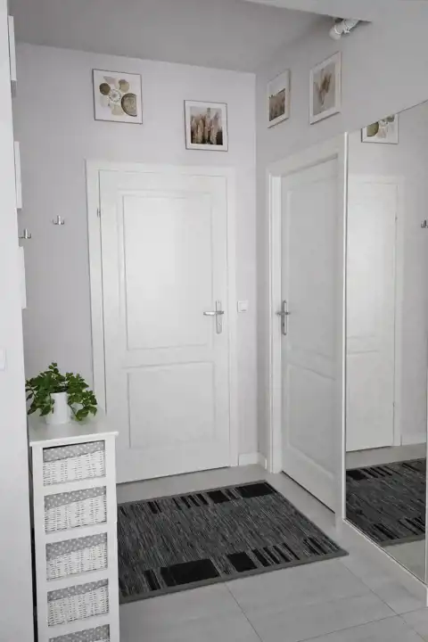 Przedpokój (3,7 m²) – z dużym lustrem i wygodnym wejściem do mieszkania