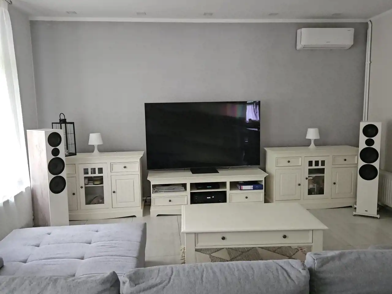 W części salonowej: kanapa, komody, szafka RTV, stolik kawowy, klimatyzator, dywanik