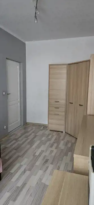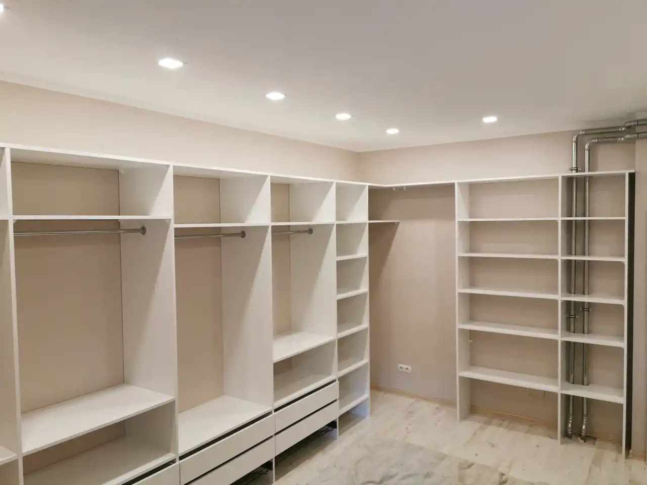 Pokój 1 (17 m²) – przestronna sypialnia z dużą, zabudowaną szafą na dwóch ścianach, półkami i szufladami, łóżkiem z materacem oraz szafkami nocnymi