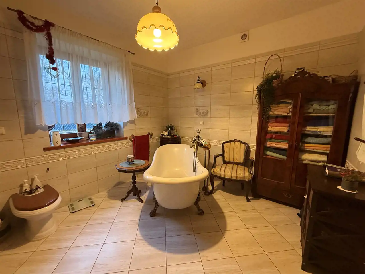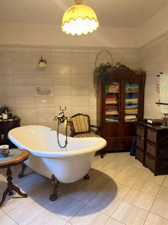 - klasyczny pokój kąpielowy z wolnostojącą wanną oraz bezpośrednim wejściem do garderoby