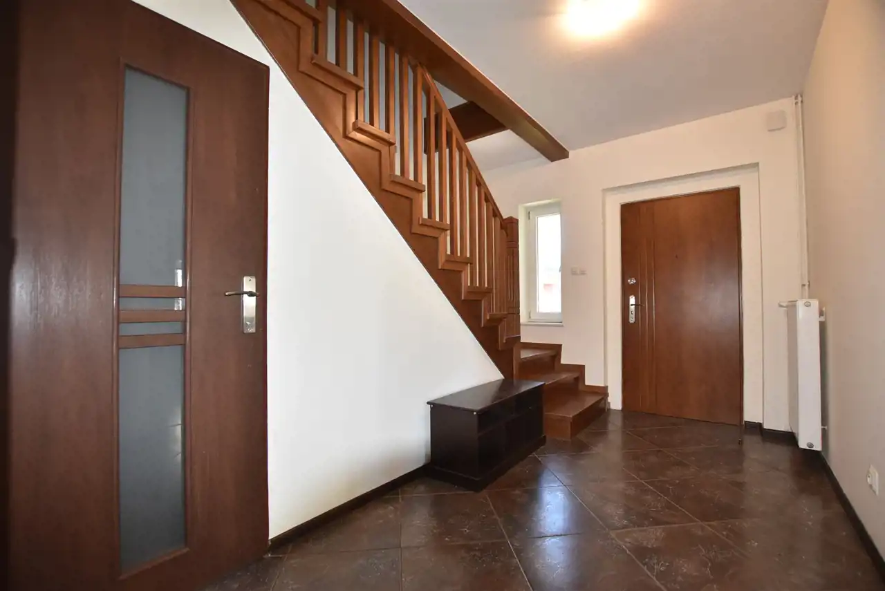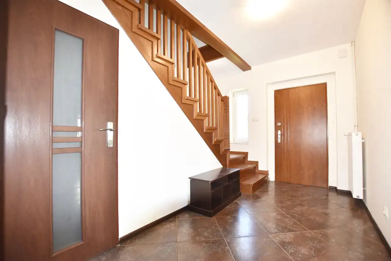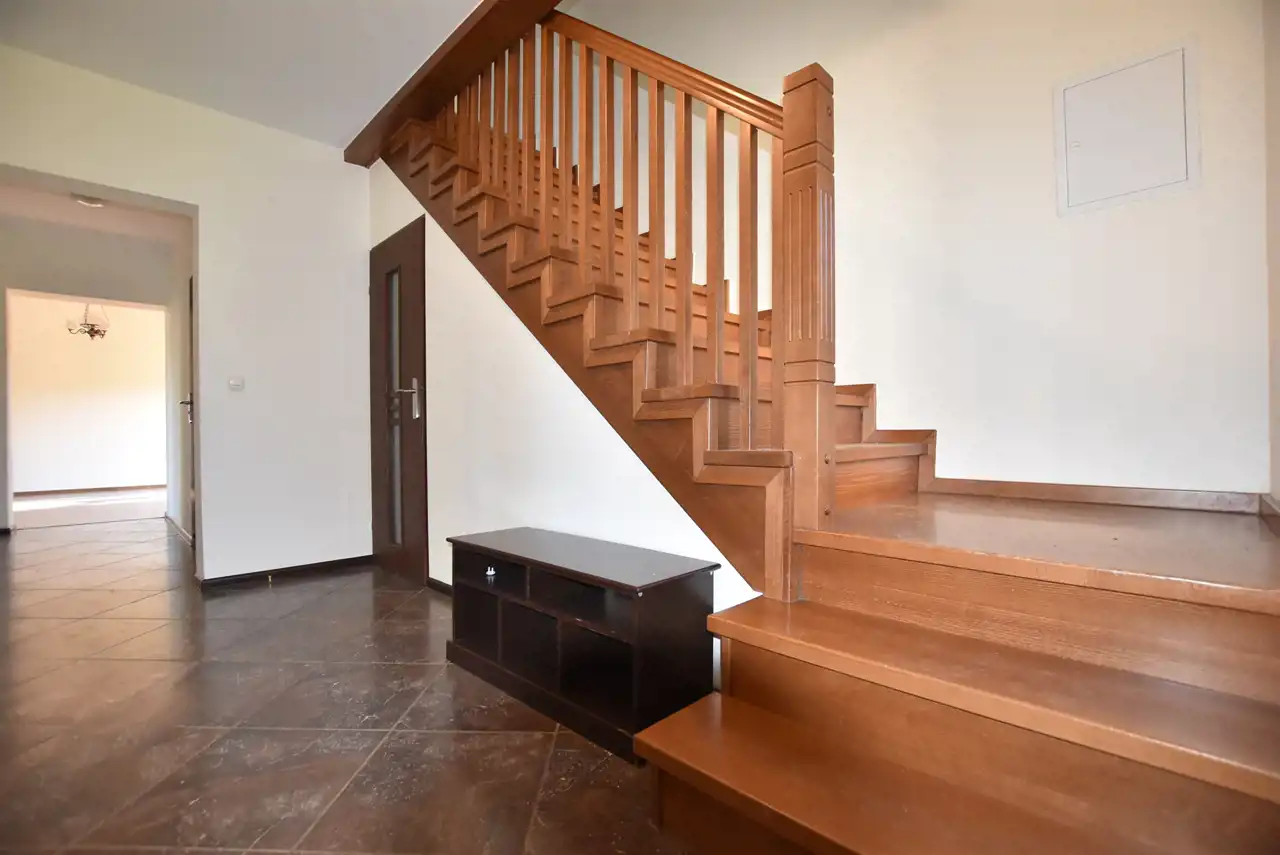 - widny korytarz z klatką schodową - wejście na piętro (schody jesionowe w bardzo dobrym stanie) oraz z zejściem do piwnicy. Piwnica z oknem z kratą, na podłodze płytki;
