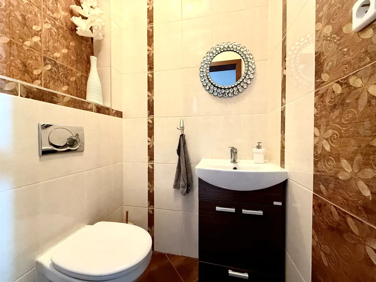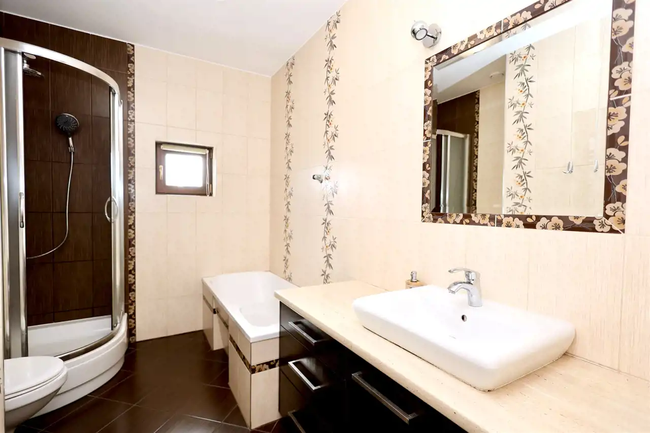 - jasną łazienkę z oknem, wanną, prysznicem, umywalką i WC.