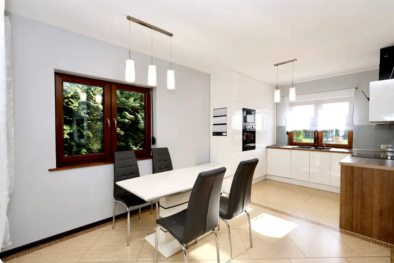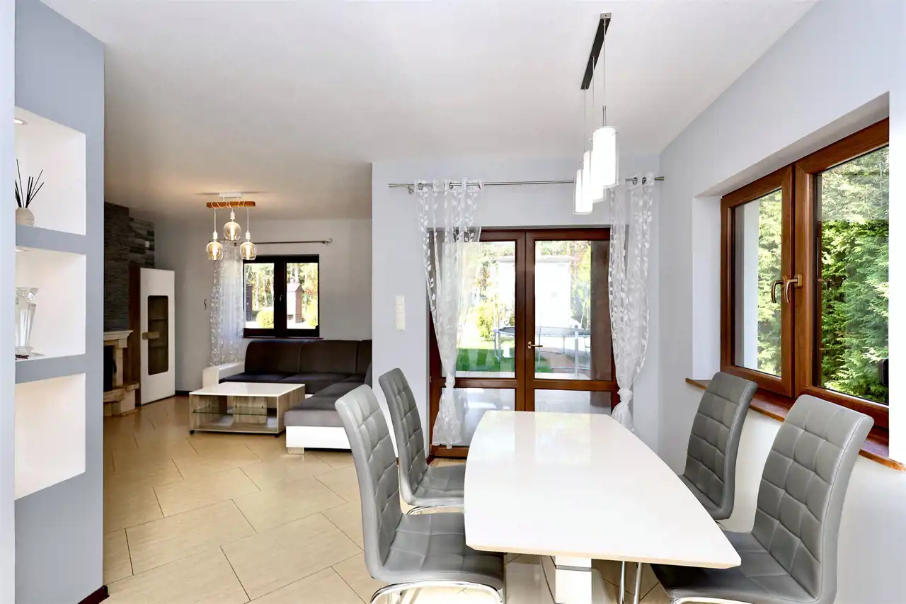 Jadalnia usytuowana przy oknie, z wyjściem na taras,