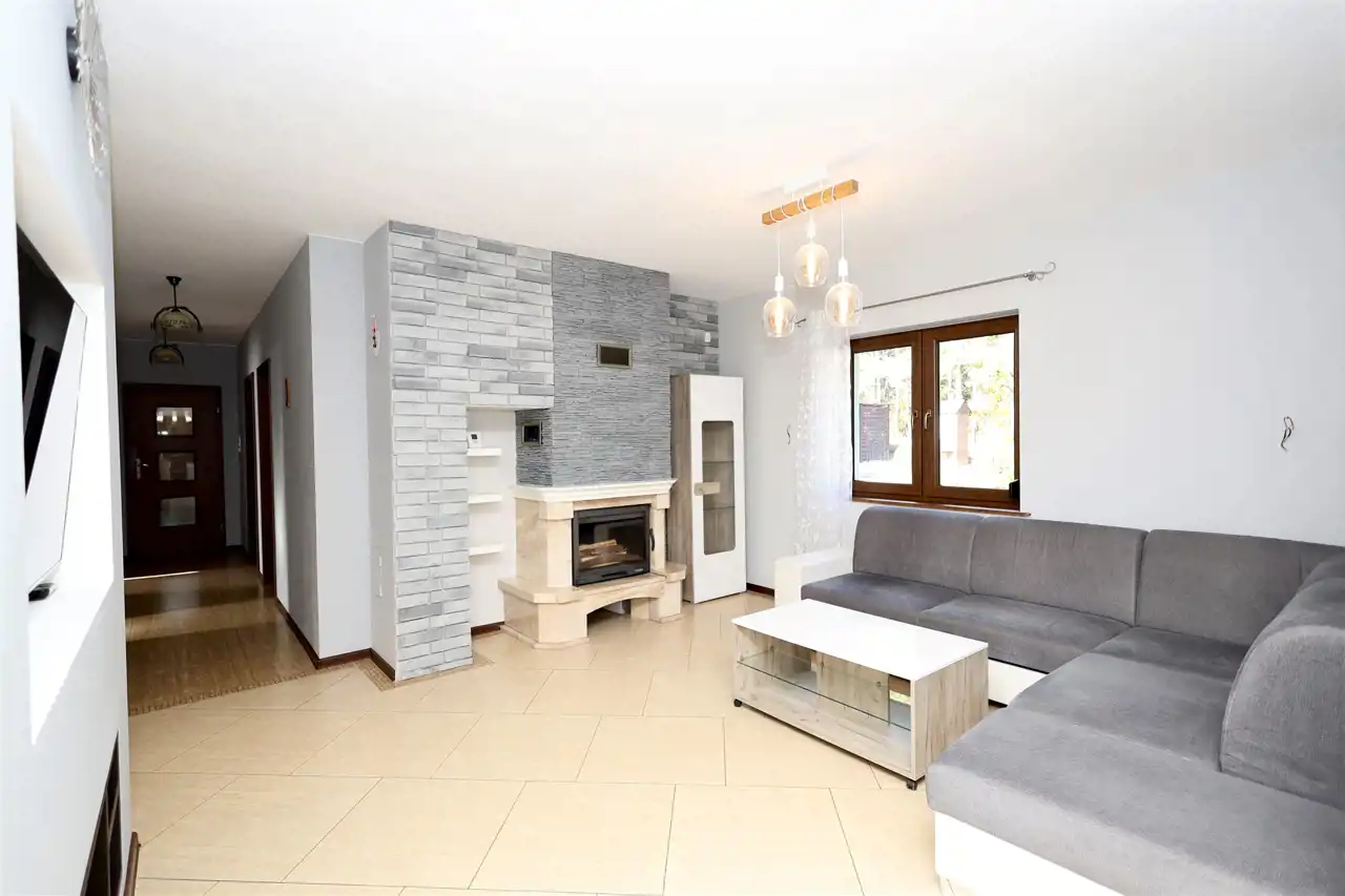 Strefa dzienna to przestronny salon z kominkiem, połączony z jadalnią i otwartą kuchnią w zabudowie meblowej, przedpokój z dużą szafą przy wejściu oraz WC dla gości.