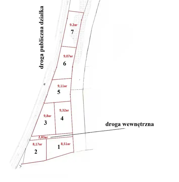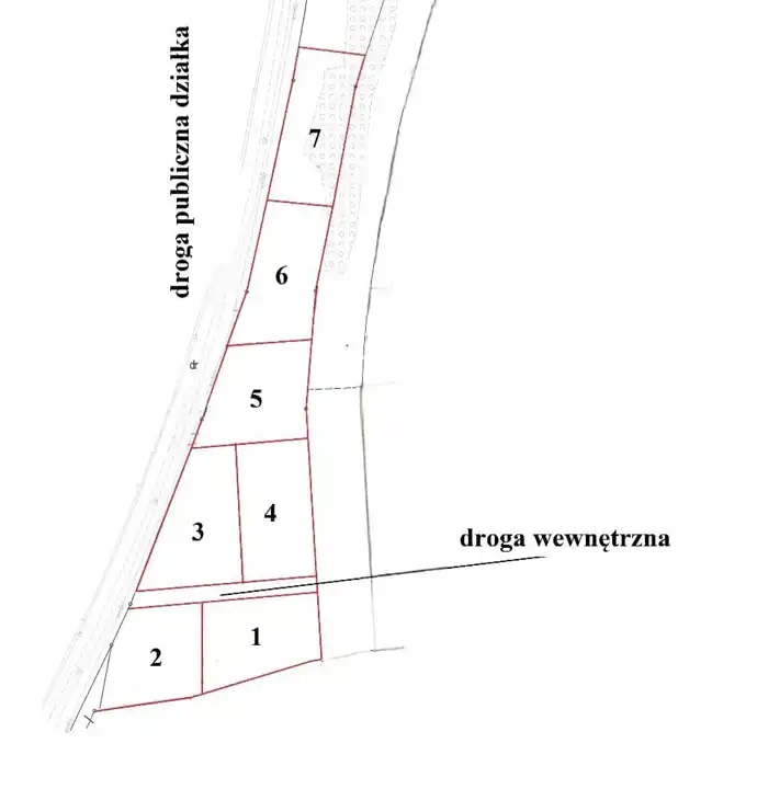 5 działek posiada bezpośredni dostęp do grogi gminnej a dla dla 2 działek wydzielono drogę wewnętrzną o szerokości 5m. Dojazd do działek z 2 stron.
