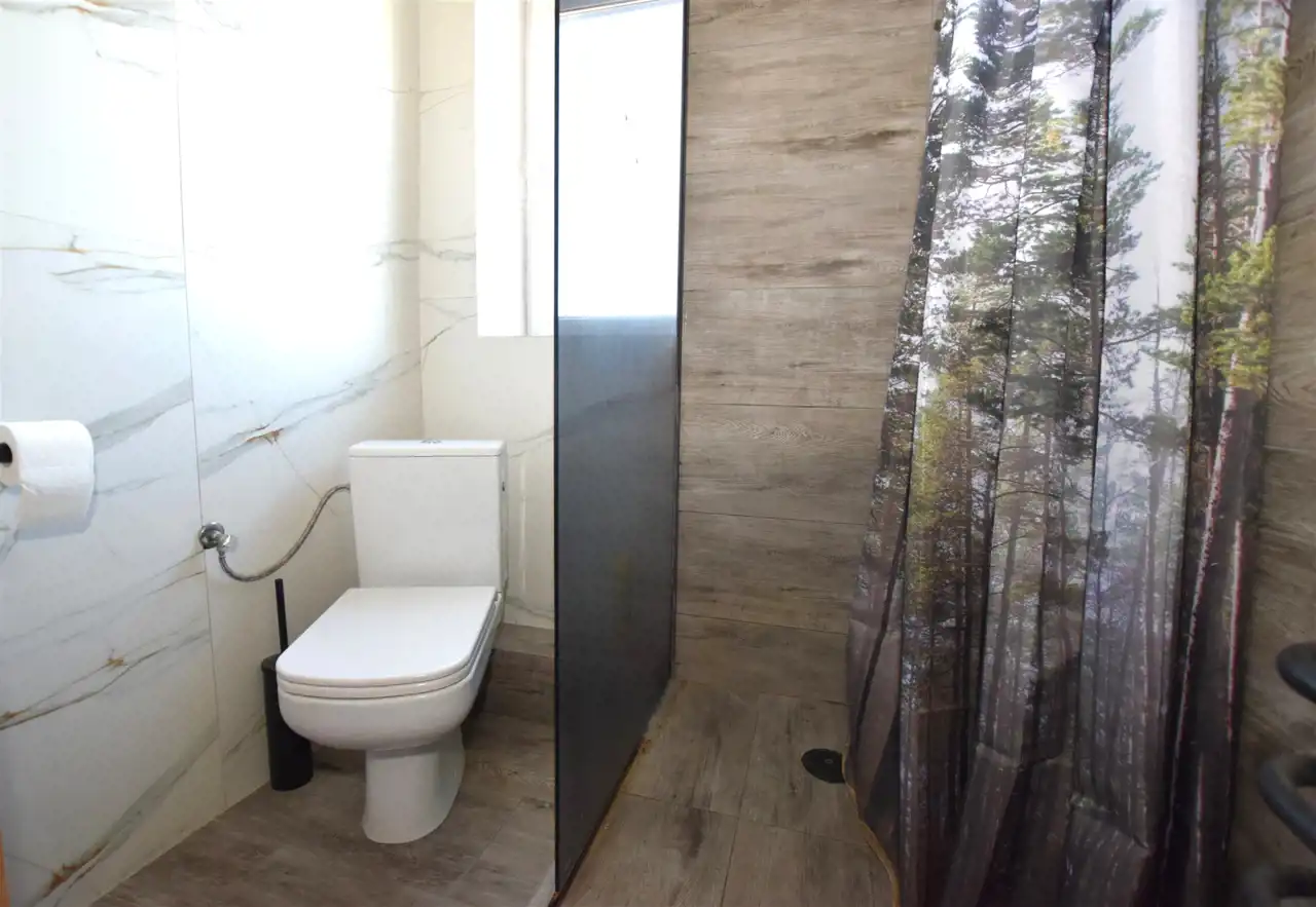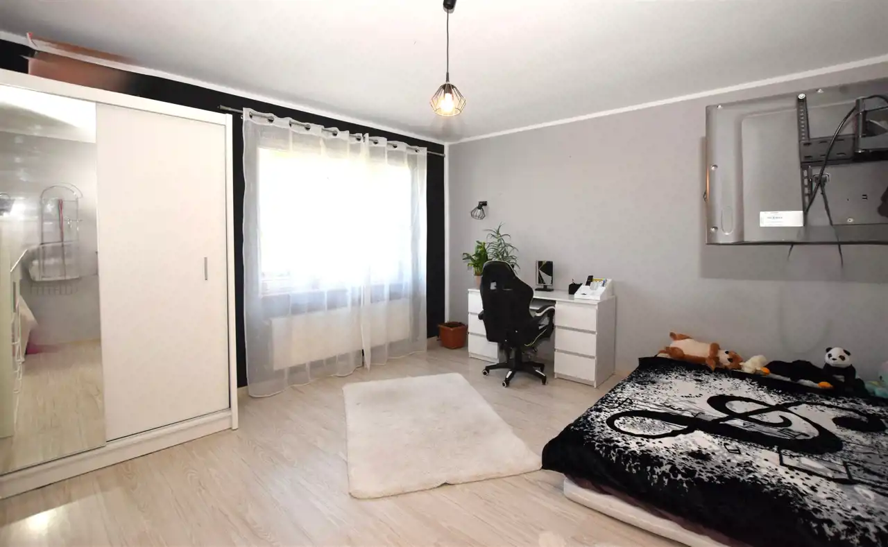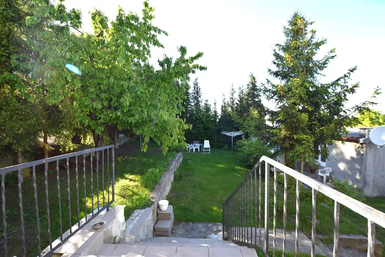 Schodami dostaniemy się na piętro budynku, na które składają się 3 ustawne pokoje (17,38; 14,84; 7,97m2) – z jednego z pokoi dostaniemy się na duży, słoneczny taras (41,10m2), z którego rozprzestrzenia się piękny widok na panoramę Rumi i okolic, WC (3,04m2) oraz korytarza (6,41m2). Z korytarza na piętrze dostaniemy się na także drugi taras (11,42m2).