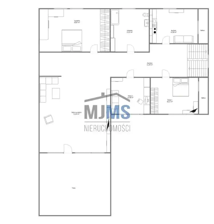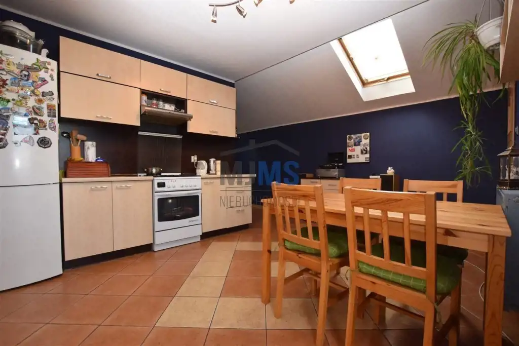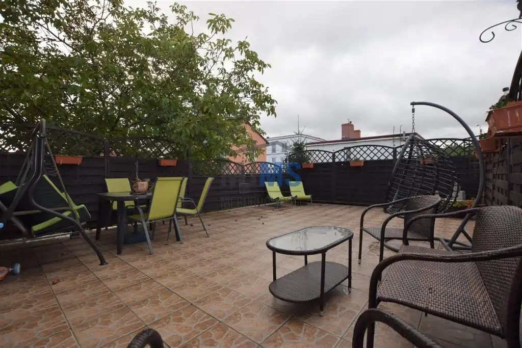 Na piętro dostaniemy się z po schodach wyłożonych terakotą. Do dyspozycji kolejna kuchnia (12,98m2) z wyjściem na balkon, duża łazienka z kabiną prysznicową (11,03m2), 3 ustawne pokoje (18,87; 18,11 oraz 12,48m2), jeden z nich z wyjściem na balkon oraz ogromny salon (51,65m2) z wyjściem na bardzo duży taras na którym przez większość dnia możemy cieszyć się słońcem. Wszystkie pokoje wyłożone panelami, salon terakotą. Na ścianach i suficie gładzie.