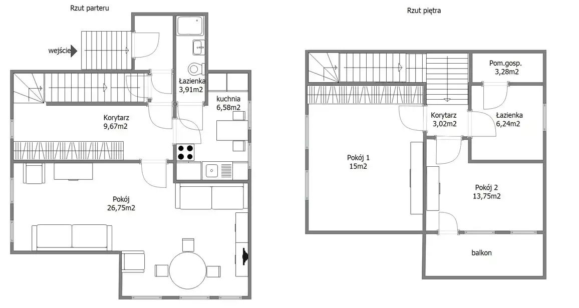 Schodami dostaniemy się na piętro budynku, na które składają się 2 ustawne pokoje (15; 13,75m2 ) - z mniejszego pokoju dostaniemy się na słoneczny balkon, łazienki (6,24m2), pomieszczenia gospodarczego (3,28m2) oraz korytarza (3,02m2).