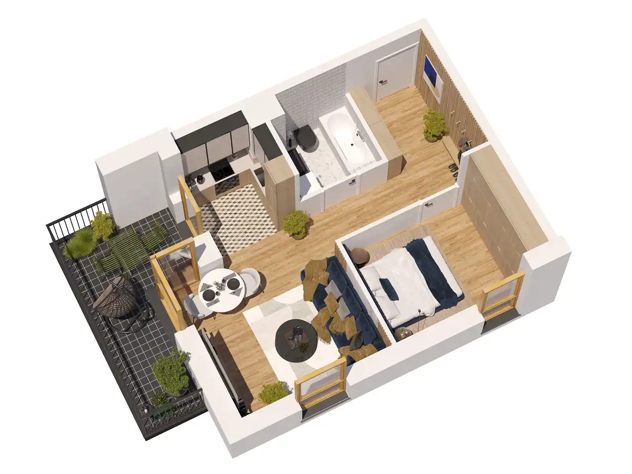 - Charakterystyka mieszkania 34.91 m2, 2 pokoje