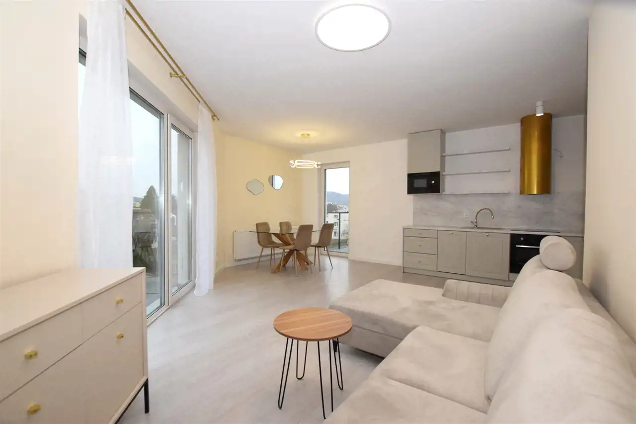 - przestronny salon z aneksem kuchennym oraz jadalnią, z wyjściem na dwa balkony, idealny do relaksu i spotkań z rodziną lub znajomymi,