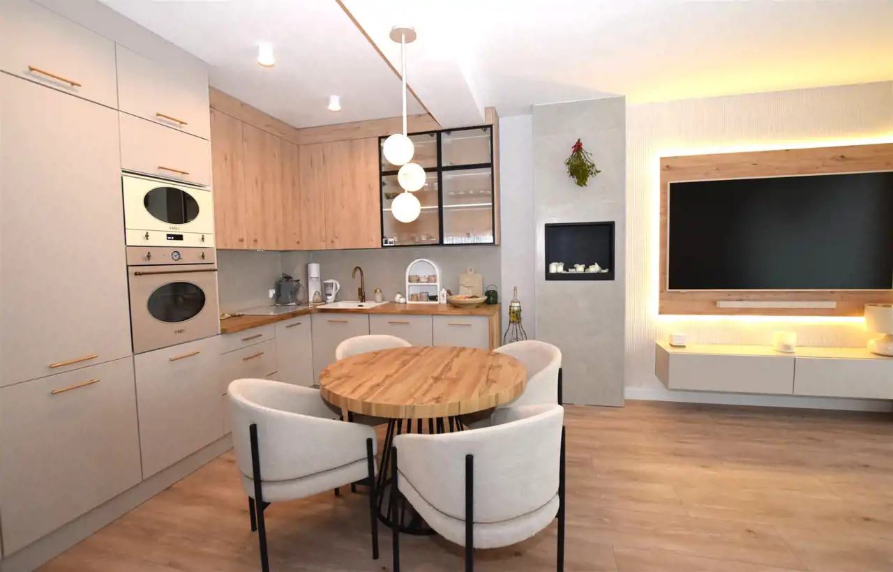 Kuchnia w zabudowie wykonanej na indywidualne zamówienie, wyposażona w wysokiej klasy sprzęt AGD (na gwarancji).
