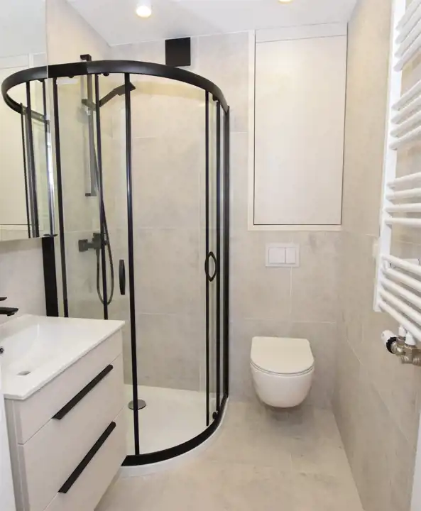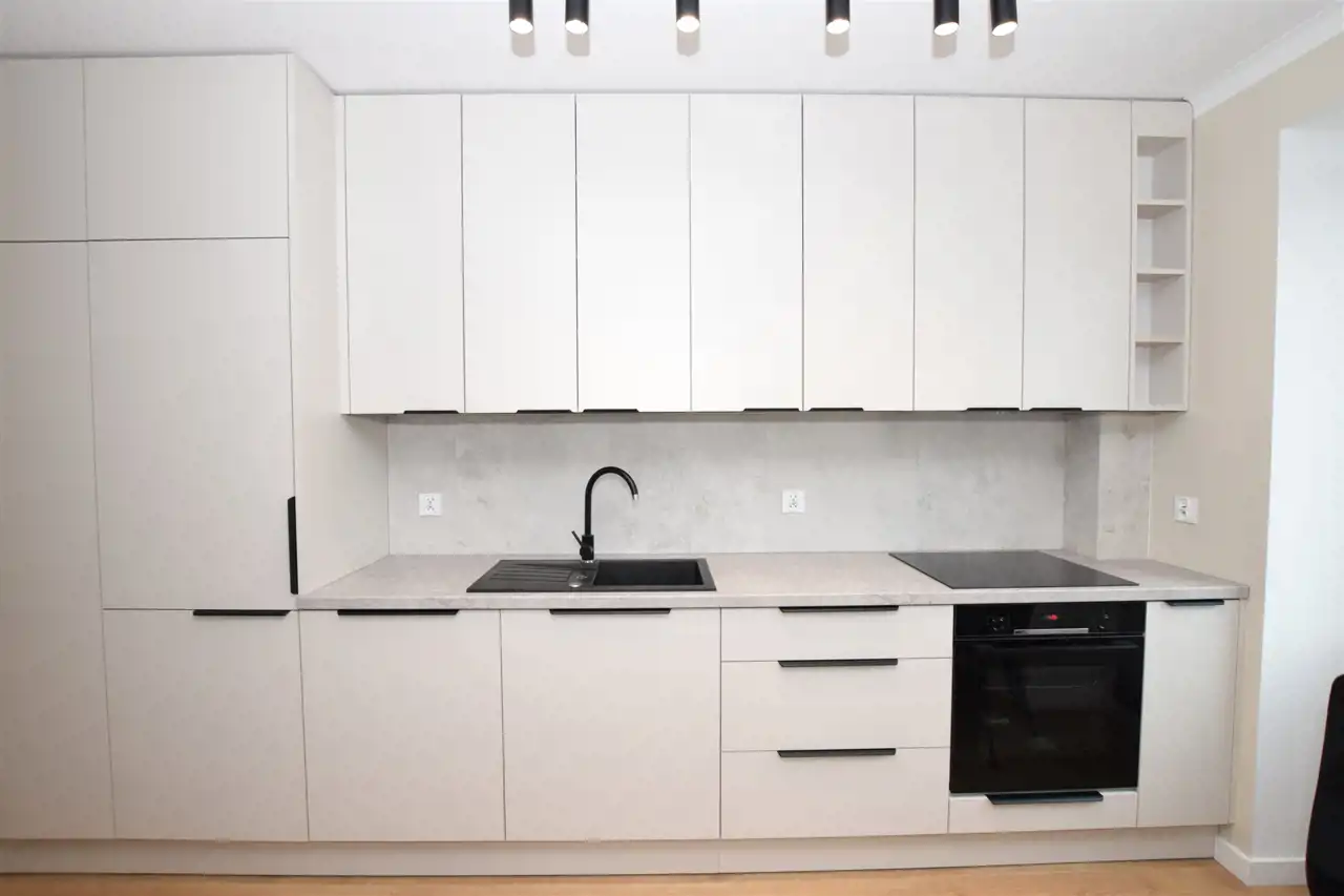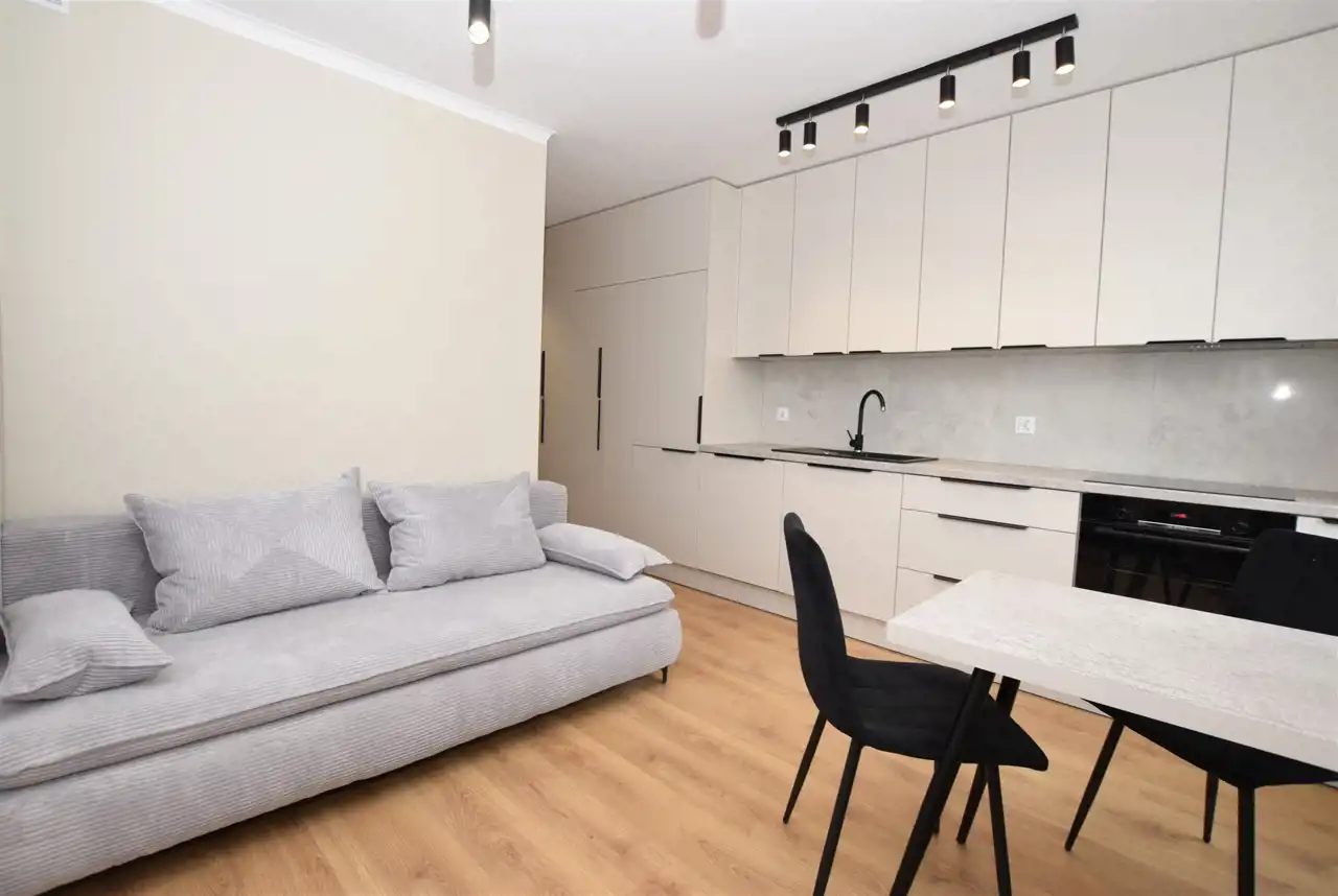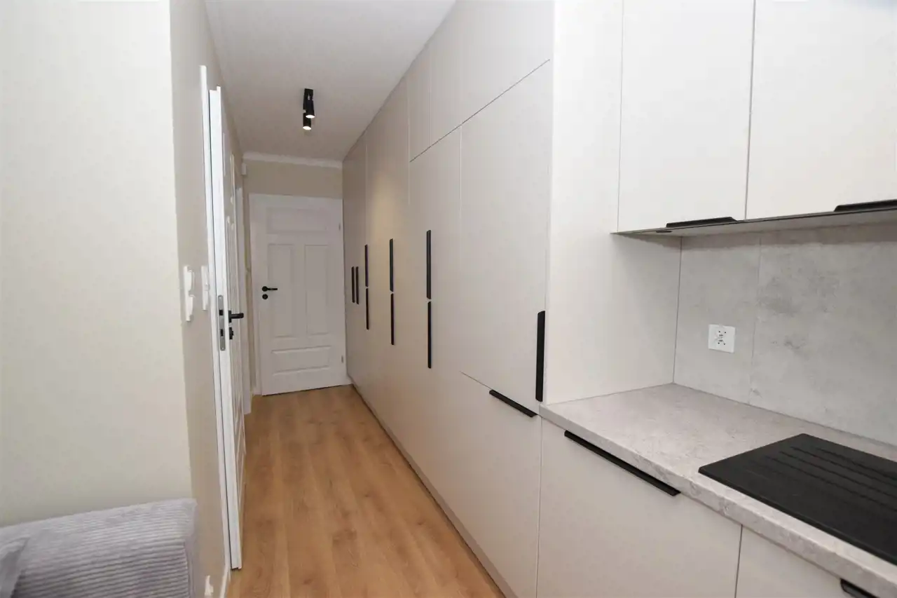 Mieszkanie składa się z dwóch pokoi, z jednego dostaniemy się na spory, słoneczny balkon. Dodatkowo do dyspozycji mamy drugi pokój, który może służyć jako sypialnia lub miejsce do pracy. Spory przedpokój z funkcjonalną zabudową meblową, w której ulokowano m.in. pralkę oraz wiatrołap. Duża, nowoczesna i funkcjonalna kuchnia z nowym sprzętem AGD (piekarnik, płyta indukcyjna, okap, lodówka, zmywarka) oraz łazienka z bardzo ładną glazurą i terakotą, wyposażona w kabinę prysznicową podwieszaną toaletę typu Geberit.