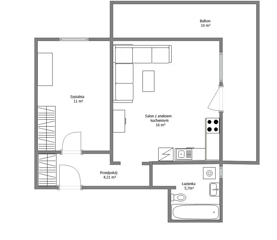 - Balkon narożny – ok. 10 m², słoneczny, idealny do wypoczynku
