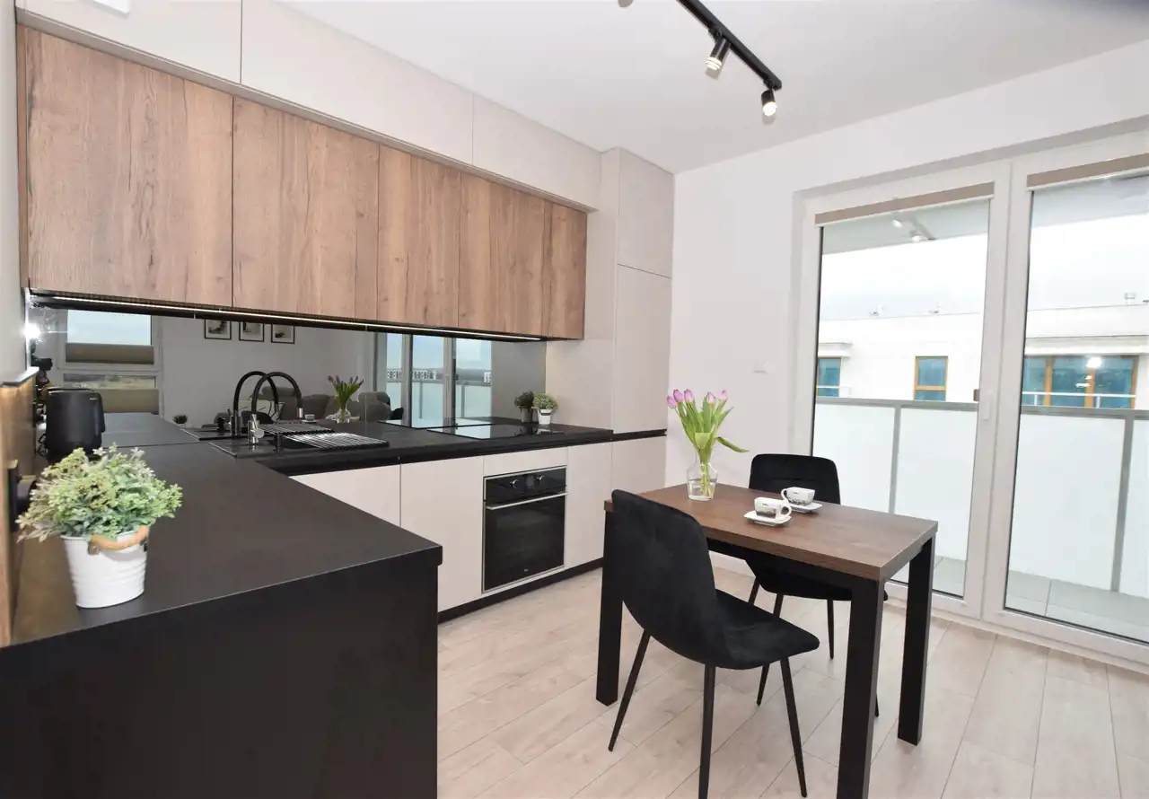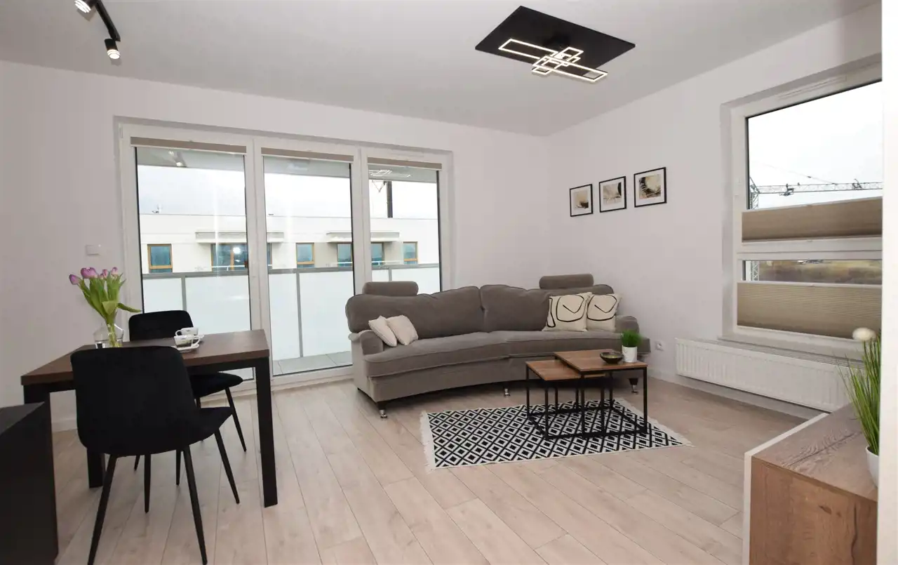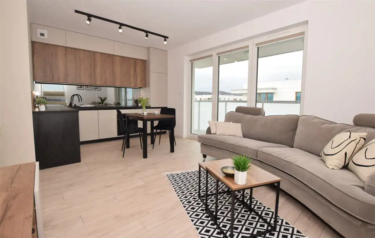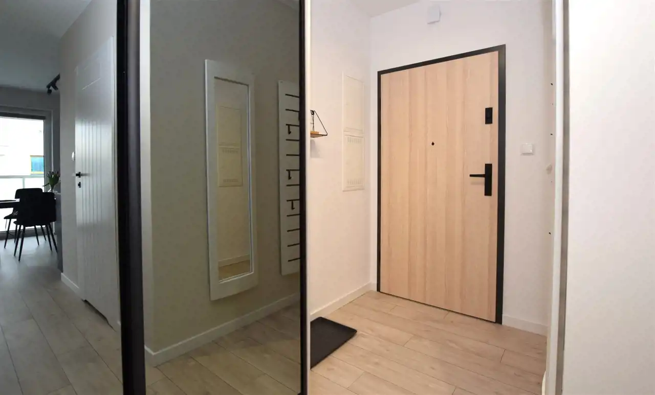 Do mieszkania wchodzimy przez antywłamaniowe drzwi do przedpokoju z dużą szafą z lustrem i wieszakami. Z przedpokoju przechodzimy do przestronnego, słonecznego salonu połączonego z aneksem kuchennym. W salonie znajduje się wygodna sofa, stolik kawowy, komoda z TV, stół z krzesłami oraz szafki do przechowywania. Kuchnia posiada nowoczesny sprzęt AGD: pralko – suszarkę, płytę indukcyjną, piekarnik, okap, lodówkę i zmywarkę, co sprawia, że gotowanie w tym miejscu to czysta przyjemność.