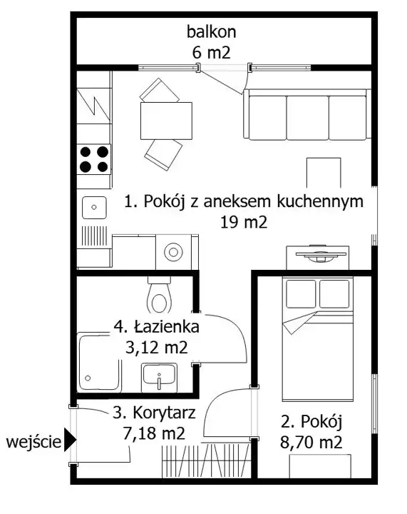- Charakterystyka mieszkania 38 m2, 2 pokoje