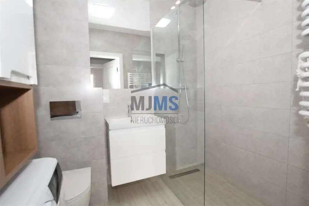Lokal znajduje się na pierwszym piętrze w trzypiętrowym budynku i składa się z przedpokoju z funkcjonalną zabudową meblową na wymiar, łazienki z wc (4,16m2), salonu z aneksem kuchennym (19,16m2) z wyjściem na duży, słoneczny, narożny balkon i dodatkowych 2 ustawnych pokoi (9,59 m2 i 8,02m2). Lokal wynajmowany z całym wyposażeniem. Salon z aneksem kuchennym wyposażony w meble kuchenne oraz sprzęt AGD (płyta, okap, piekarnik, zmywarka, lodówka) z wygospodarowanym miejscem na rozkładany stół z krzesłami. Podłogi wyłożone dobrej jakości panelami, zwieńczone listwami przypodłogowymi. Łazienka wyłożona glazurą i terakotą, wyposażona w prysznic, umywalkę, podwieszaną toaletę, pralkę oraz meble łazienkowe.