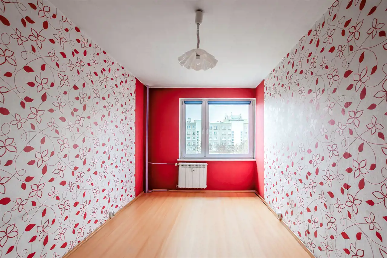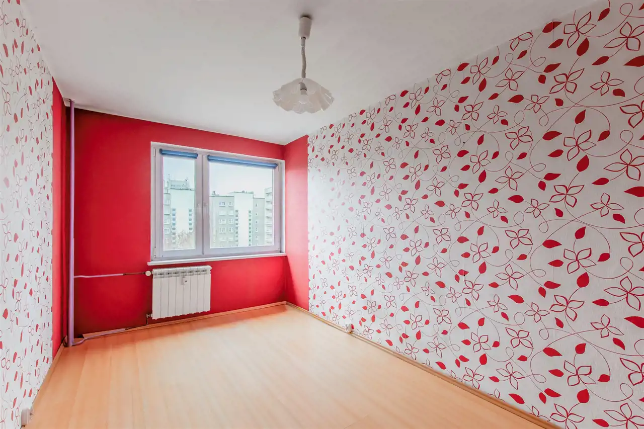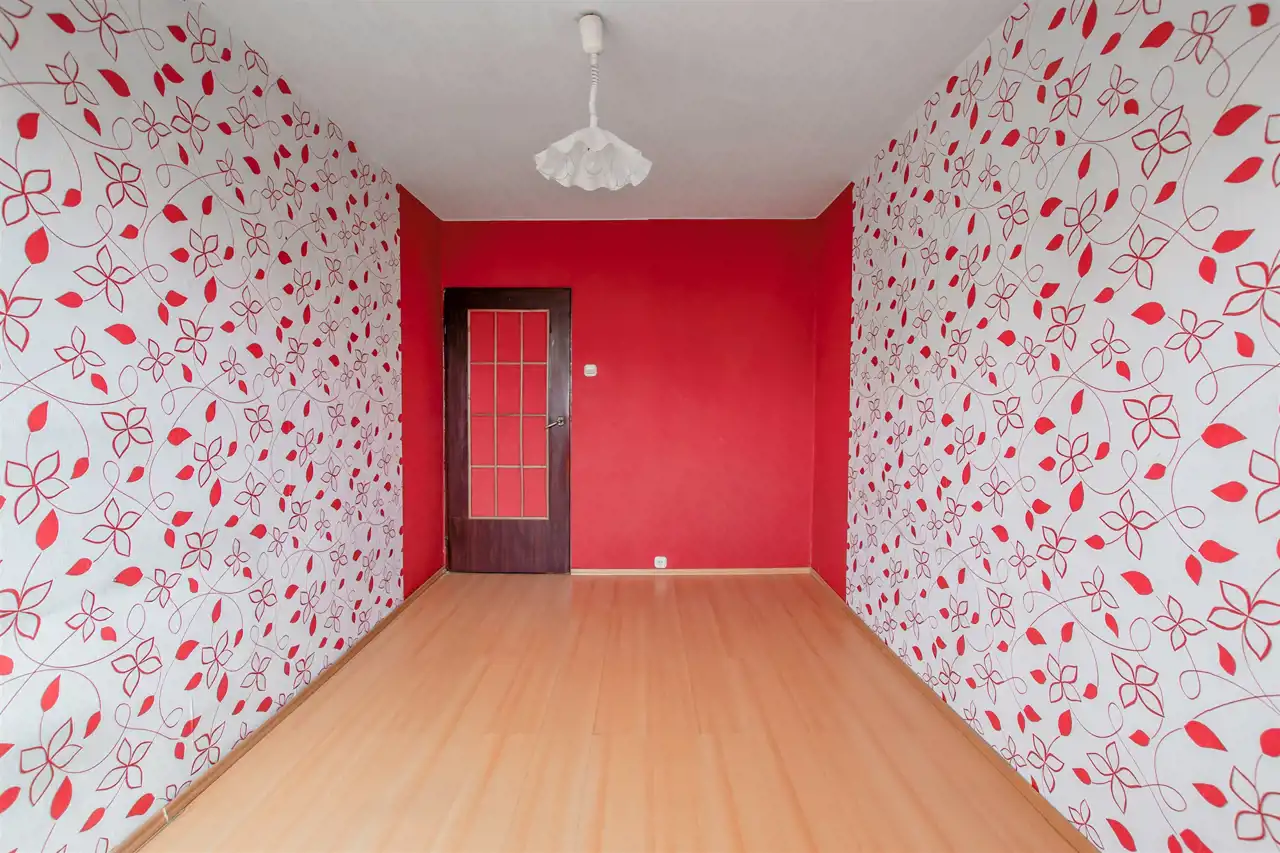 w pokojach panele podłogowe oraz ściany w tynku, a także tapety