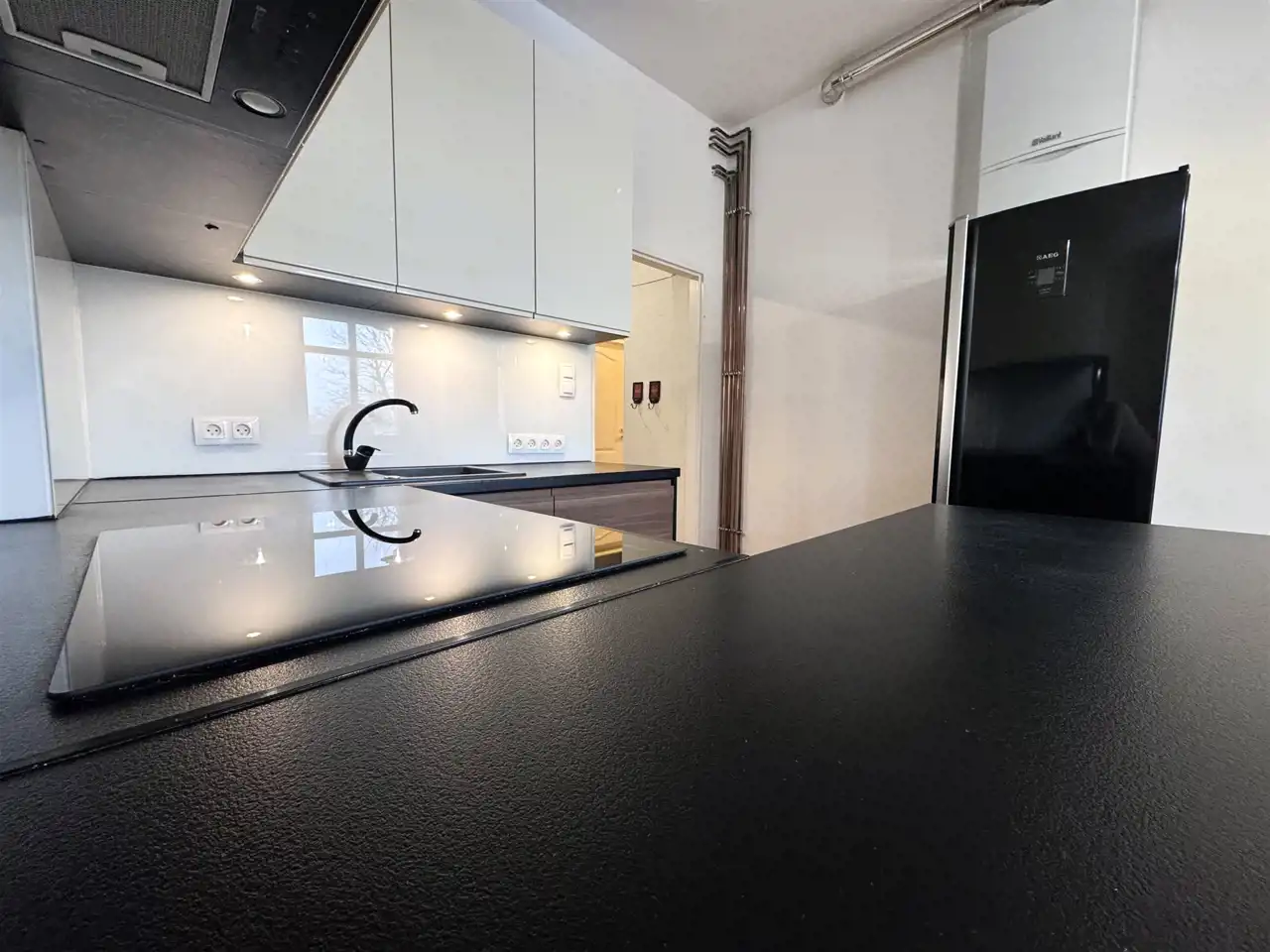 Kuchnia w pełni wyposażona w sprzęt AGD: piekarnik, lodówka, zmywarka, płyta indukcyjna.