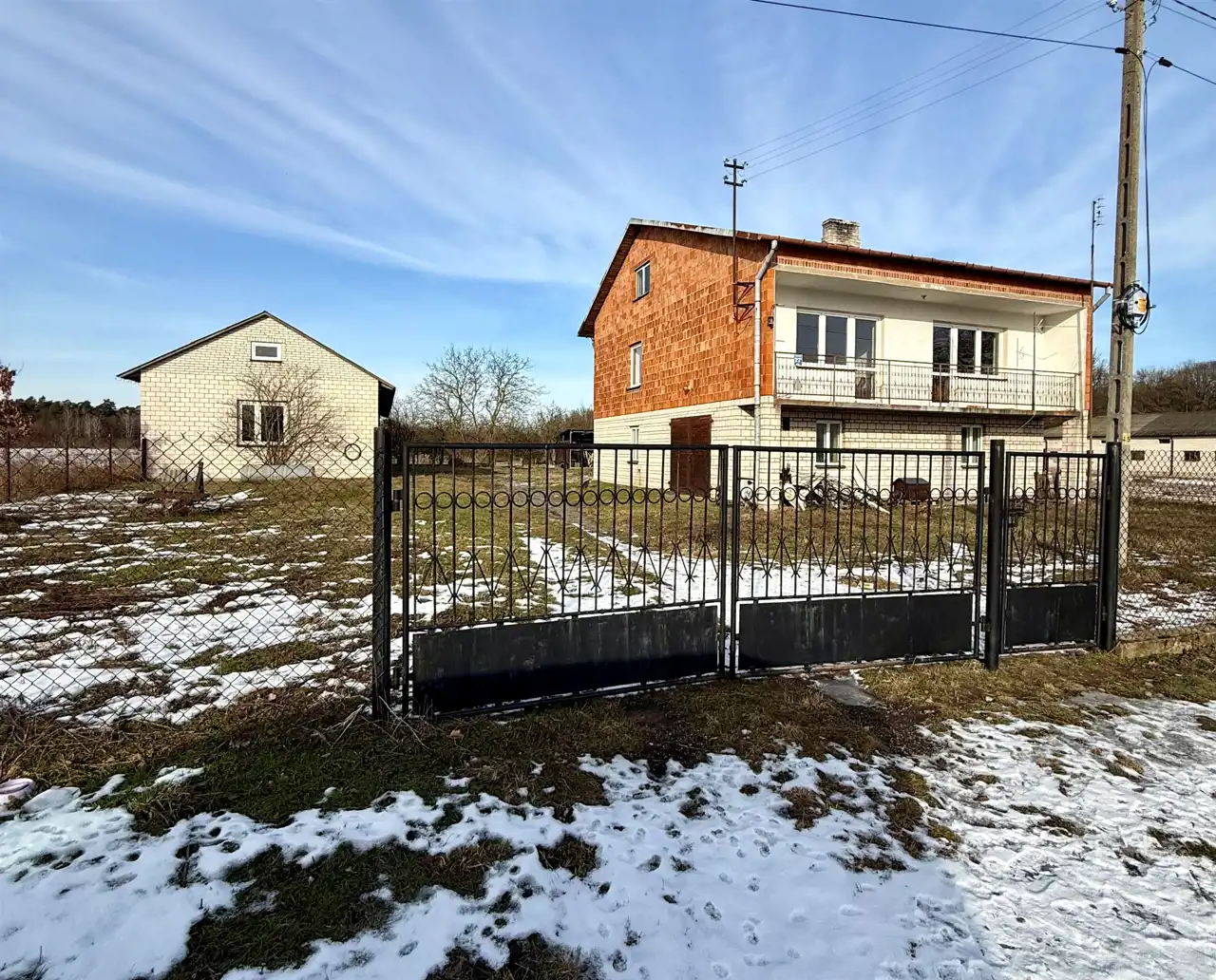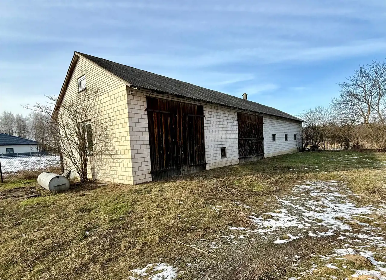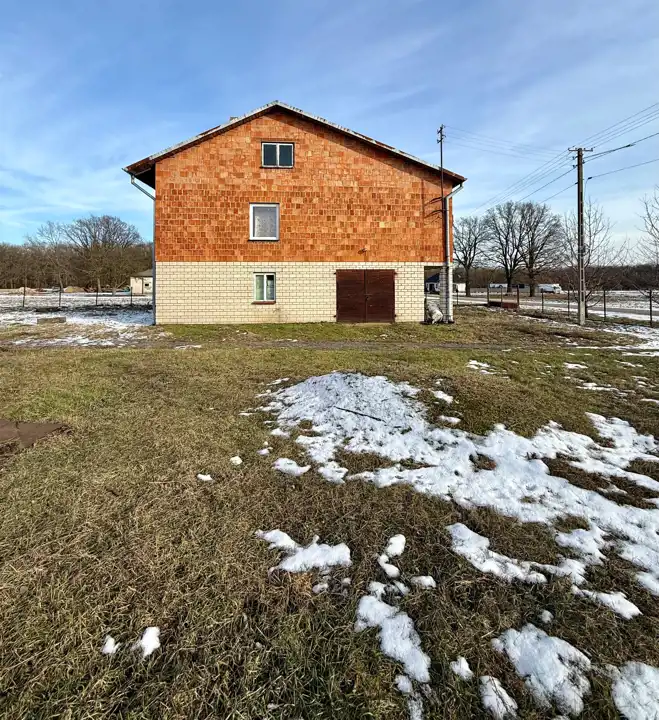 Dom składa się z: 5 pokoi, kuchnia, łazienka, wc, przedpokój, strych. Garaż w bryle budynku. Dom do generalnego remontu. Budynki gospodarcze w stanie bdb.