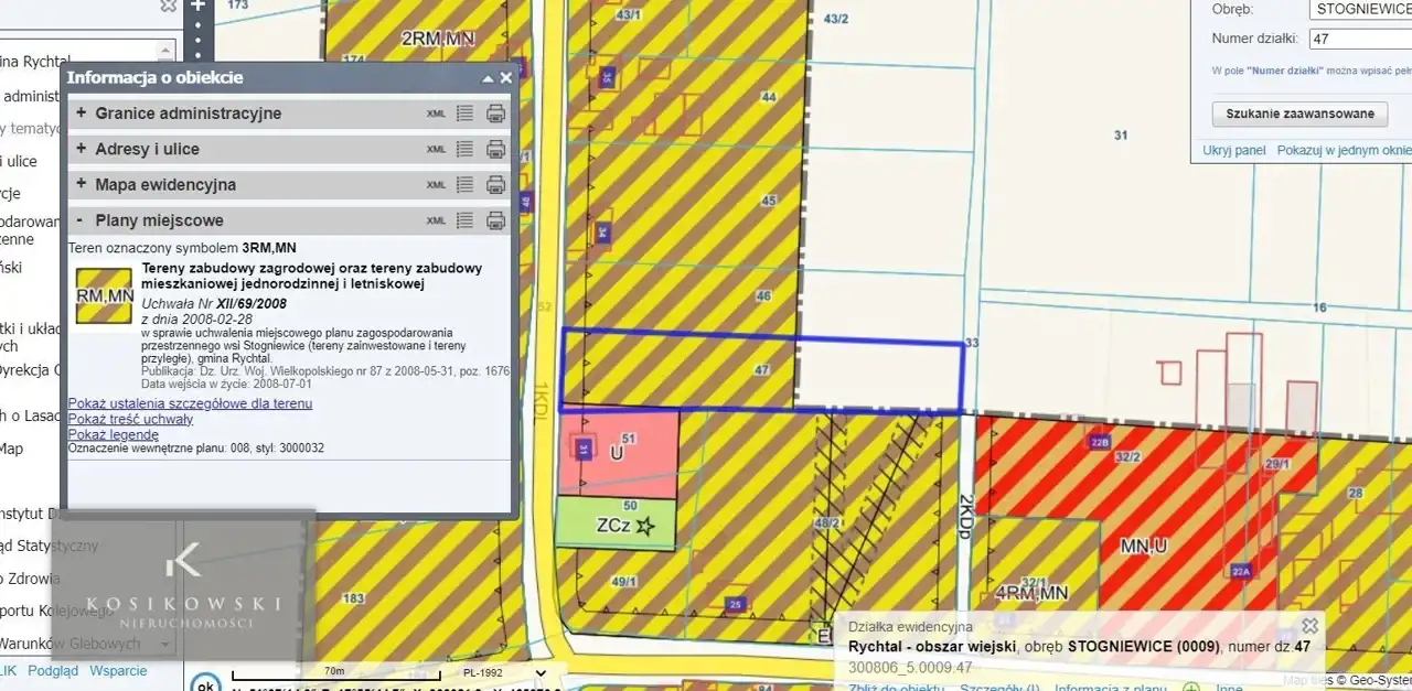 Działka nr 47 jest częściowo objęta planem zagospodarowania przestrzennego z przeznaczeniem pod tereny zabudowy zagrodowej oraz zabudowy mieszkaniowej i letniskowej – symbol 3RM,MN