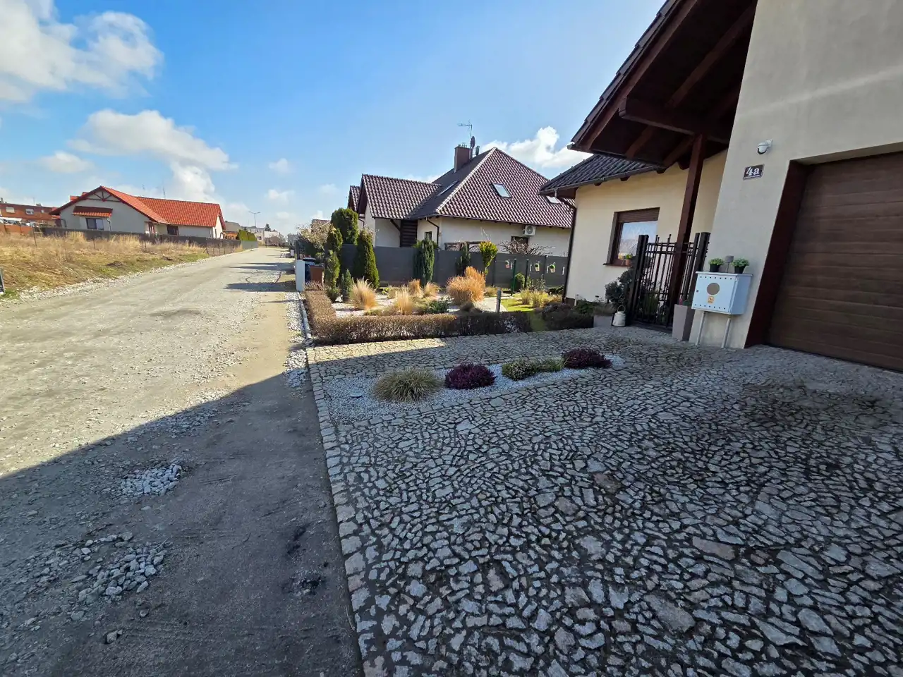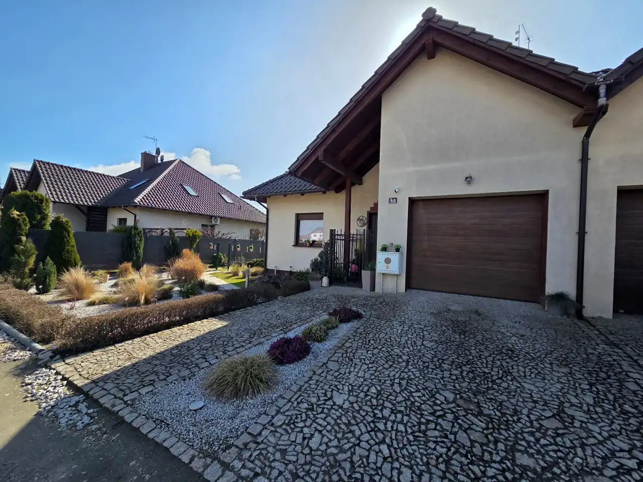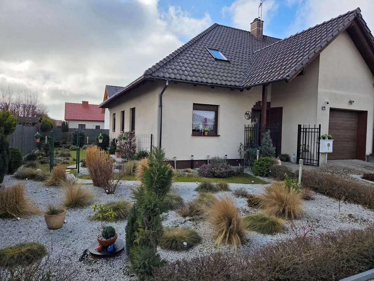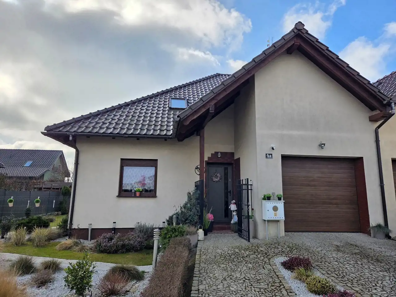 OPIS: materiał budowlany - siporex/ytong, ocieplony i otynkowany, dach pokryty dachówką ceramiczną. Teren nieruchomości zagospodarowany i ogrodzony płotem metalowym. Chodniki i podjazdy wyłożone kamieniem granitowym i kostką brukową. Droga dojazdowa utwardzona.