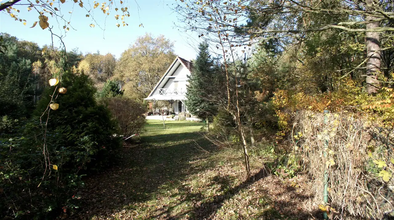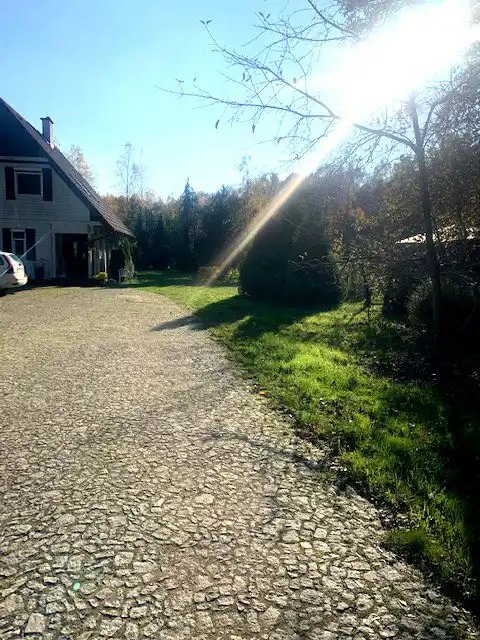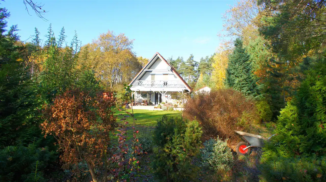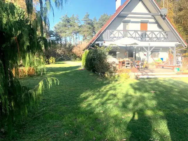Całoroczny dom w lesie, 200 metrów od zalewu w Dąbczu, zlokalizowany na dużej (2500 mkw) działce, w otulinie lasu, z szerokim, rezydencjonalnym, wyłożonym kostką wjazdem.