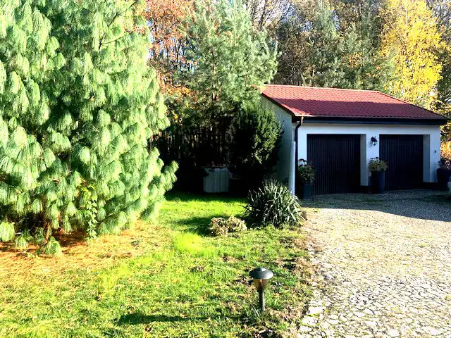 Wolnostojący garaż wraz z domem usytuowany jest wśród pięknych zielonych i kolorowych nasadzeń.
