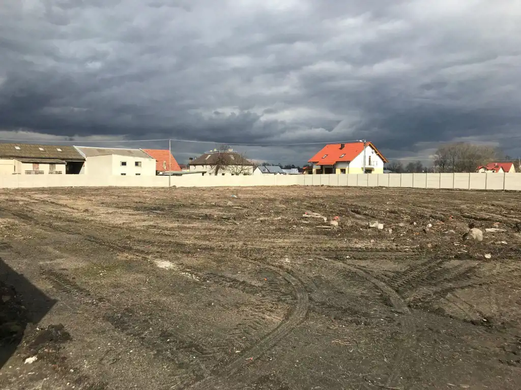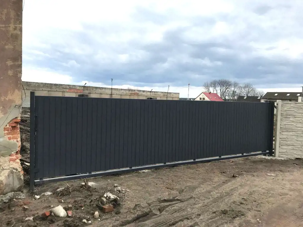 Działka ogrodzona betonowym płotem z bramami wjazdowymi.