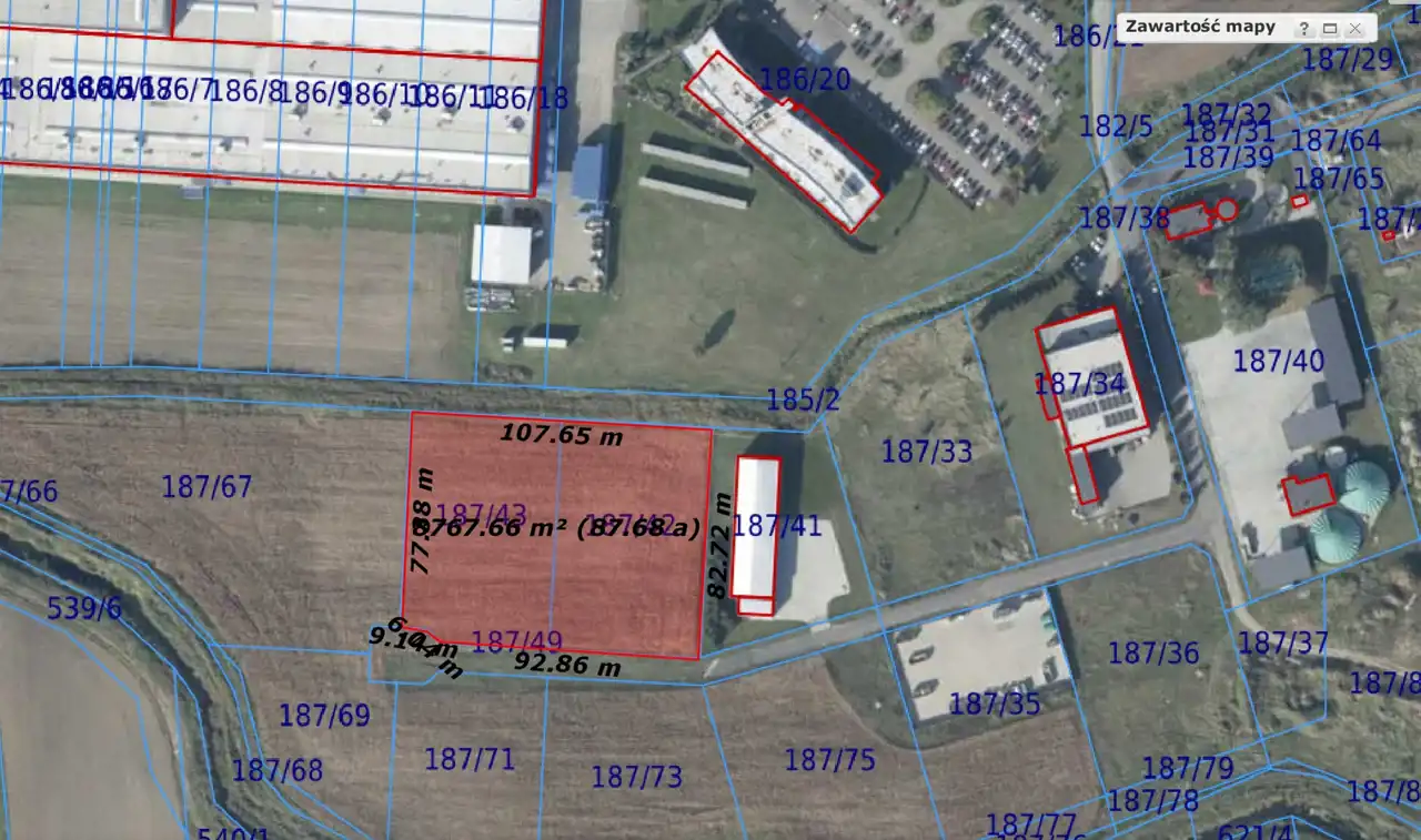 Powierzchnia gruntu: 8903 m2 (2 działki o powierzchniach: 4484 m2 i 4419 m2).