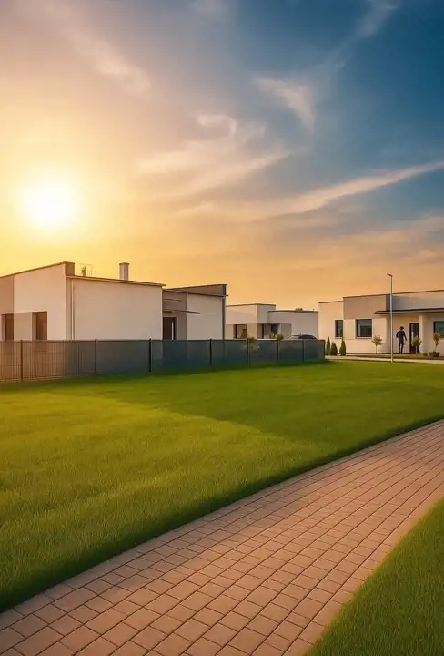 Zabudowa jednorodzinna – w sąsiedztwie nowoczesne, parterowe domy z płaskimi dachami.