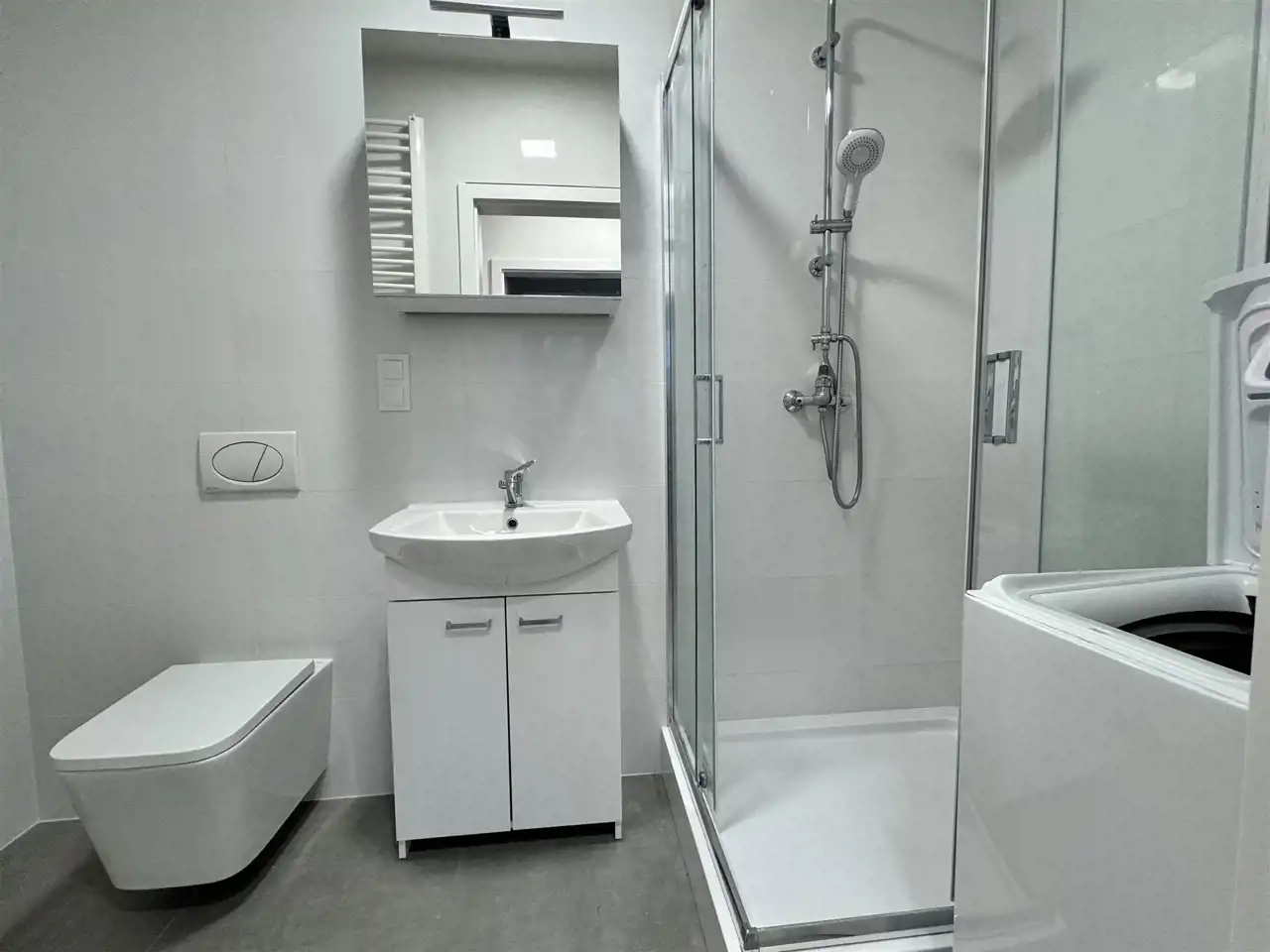 W łazience prysznic, pralka, WC, szafka z umywalką i lustro.