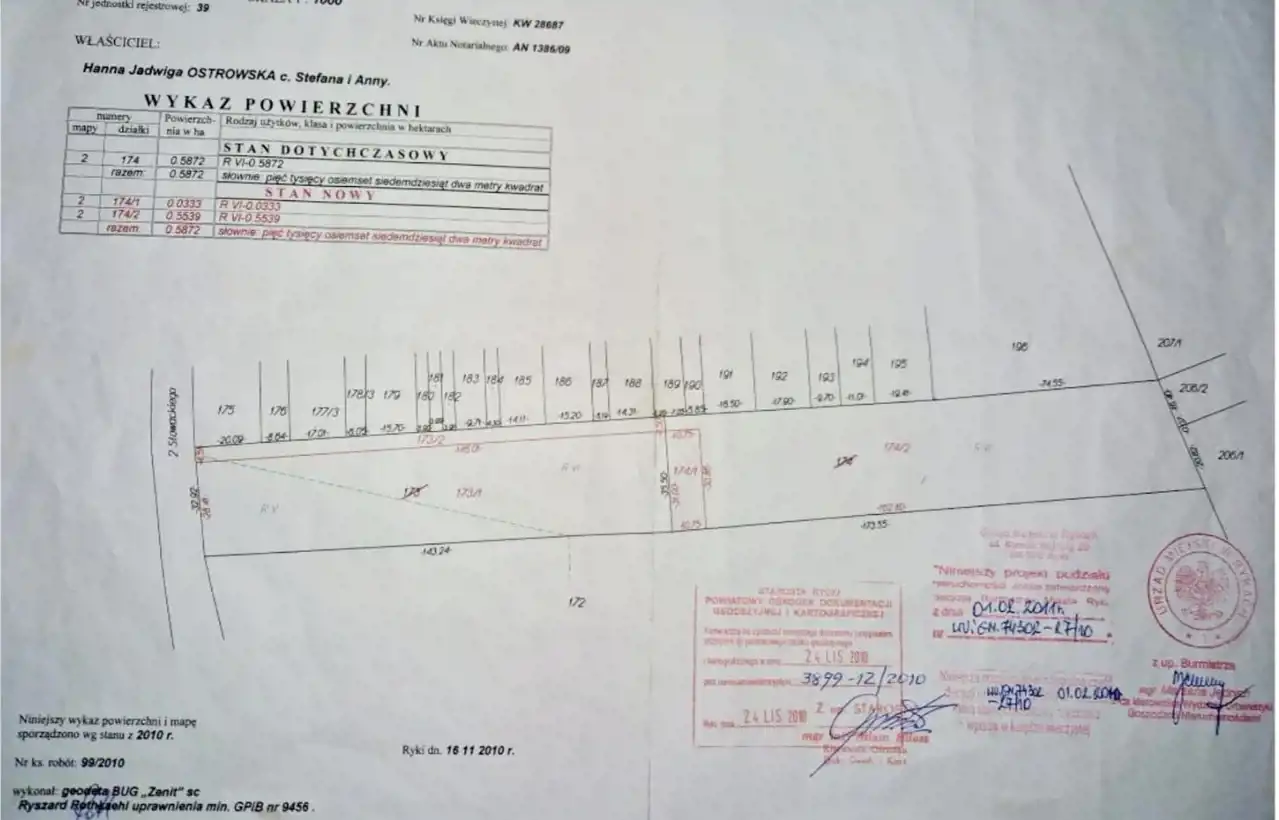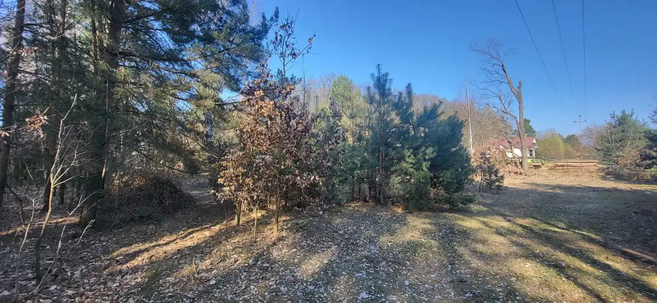 Działka ma powierzchnię 5539 m2 z czego ok. 2500m2 leży w terenie przeznaczonym w MPZP pod zabudowę jednorodzinną MN a reszta to użytki rolne klasy VI. Działka ma szerokość 37m i jest w części porośnięta drzewami.