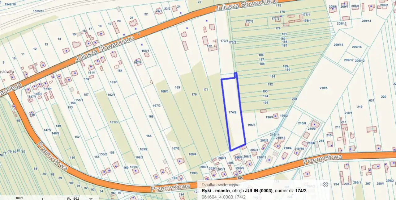 W sąsiedztwie działki zabudowane. Do centrum Ryk 3km, do Dęblina 7 km, do Lotniska Chopina w W-wie 112 km. Wylot na trasę S-12 -6 km.