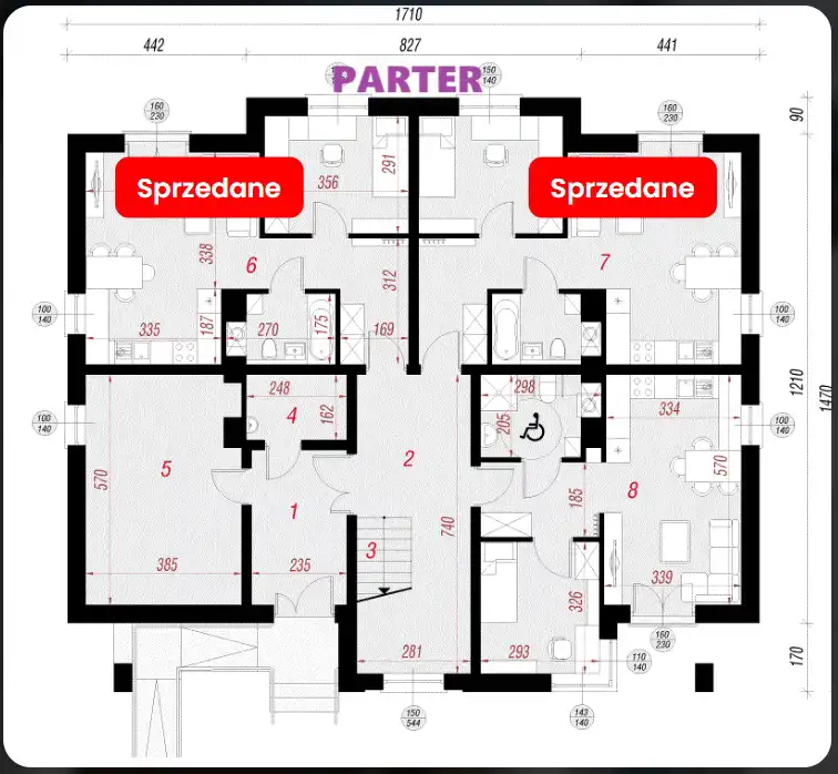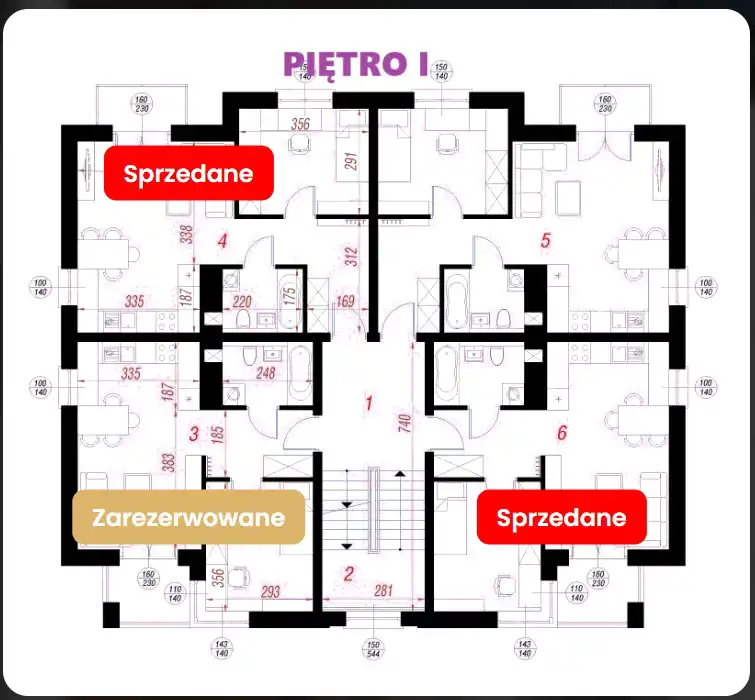 - I piętro – 4 mieszkania, w ofercie dostępne już tylko 2 mieszkania: