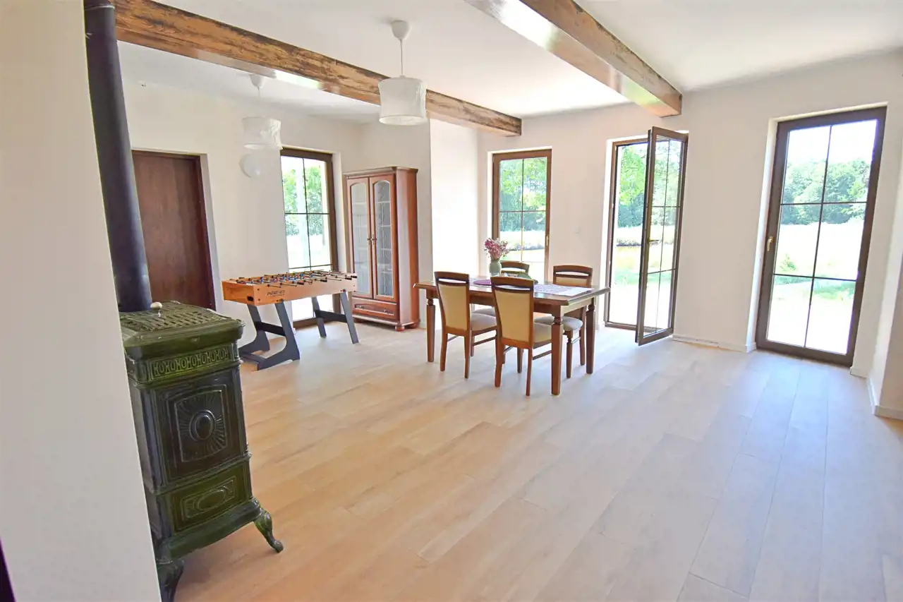 Na parterze wydzielona część dzienna - centralny jej punkt stanowi przestronny salon z jadalnią (42m2), której ozdobą są wykuszowe okna z widokiem na staw i piękny zabytkowy emaliowany kominek - oraz zamykaną część prywatną z dwoma pokojami i łazienką.