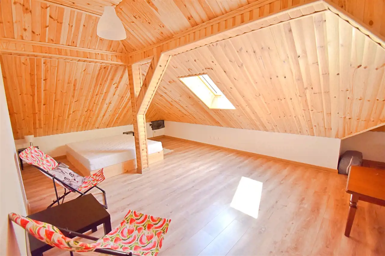 Obie części domu łączy duże pomieszczenie z drewnianymi schodami prowadzącymi na poddasze z osobnym wejściem i wyjściem na taras.