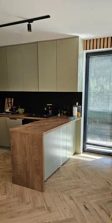 przestronny salon z aneksem kuchennym i wyjściem na duży taras o powierzchni 45 m²,