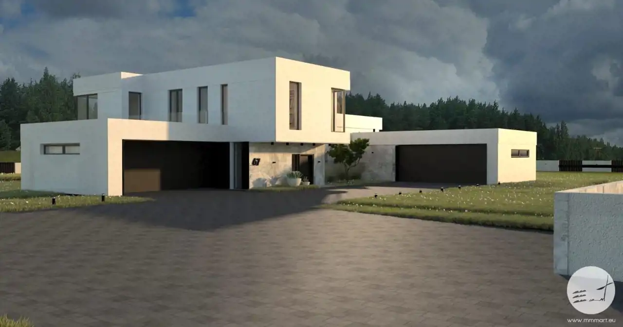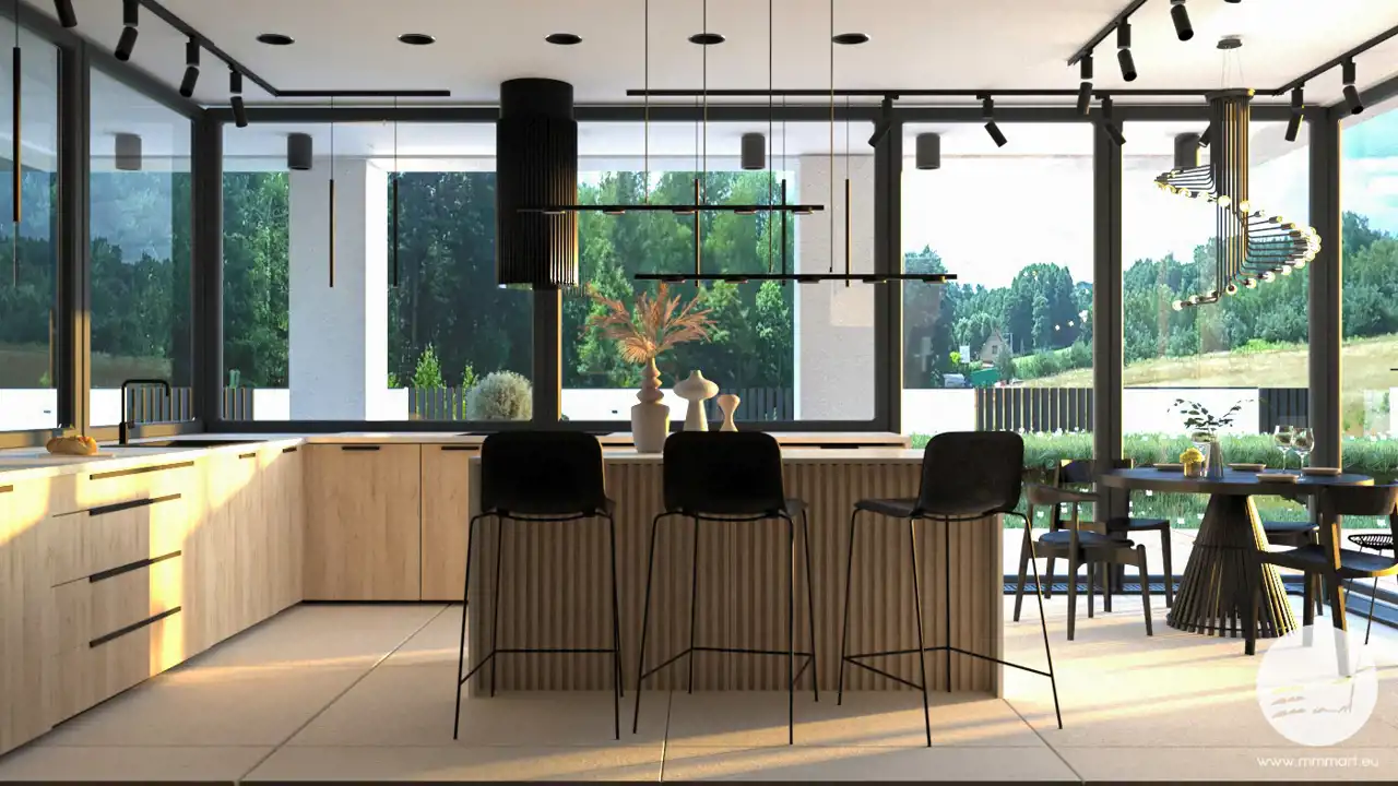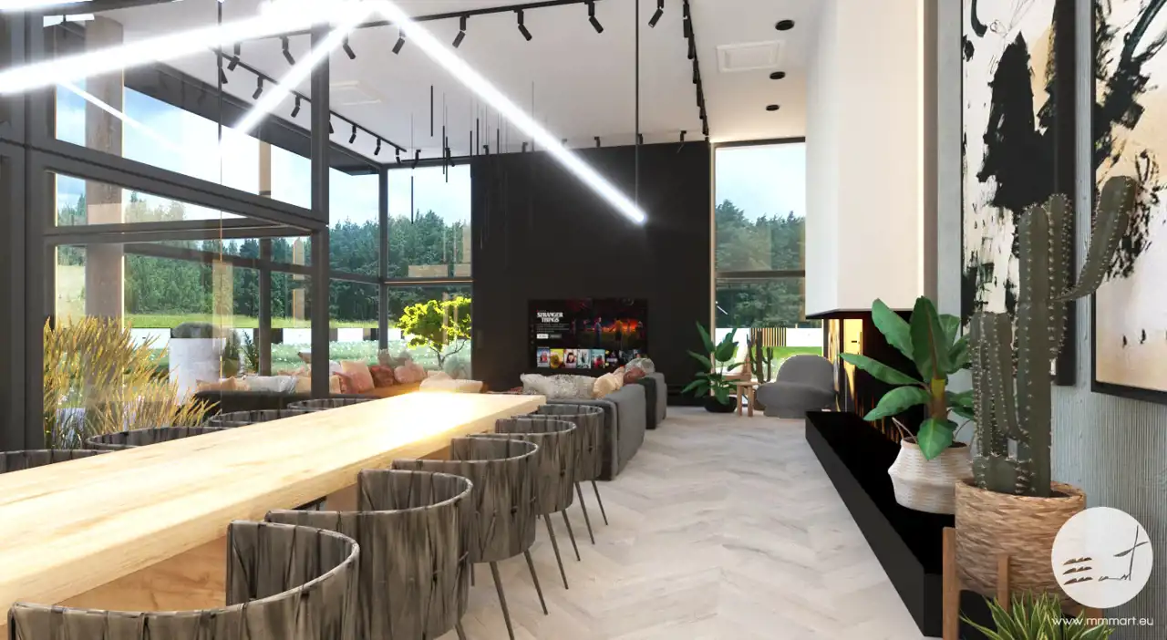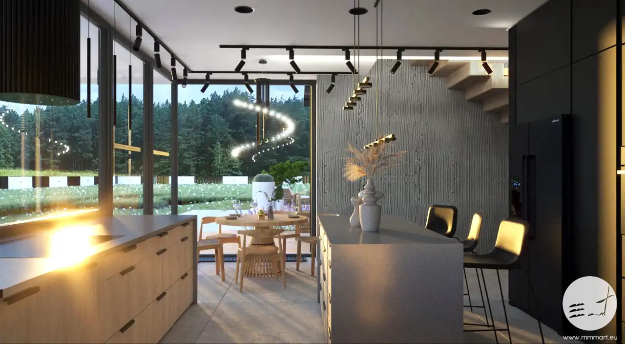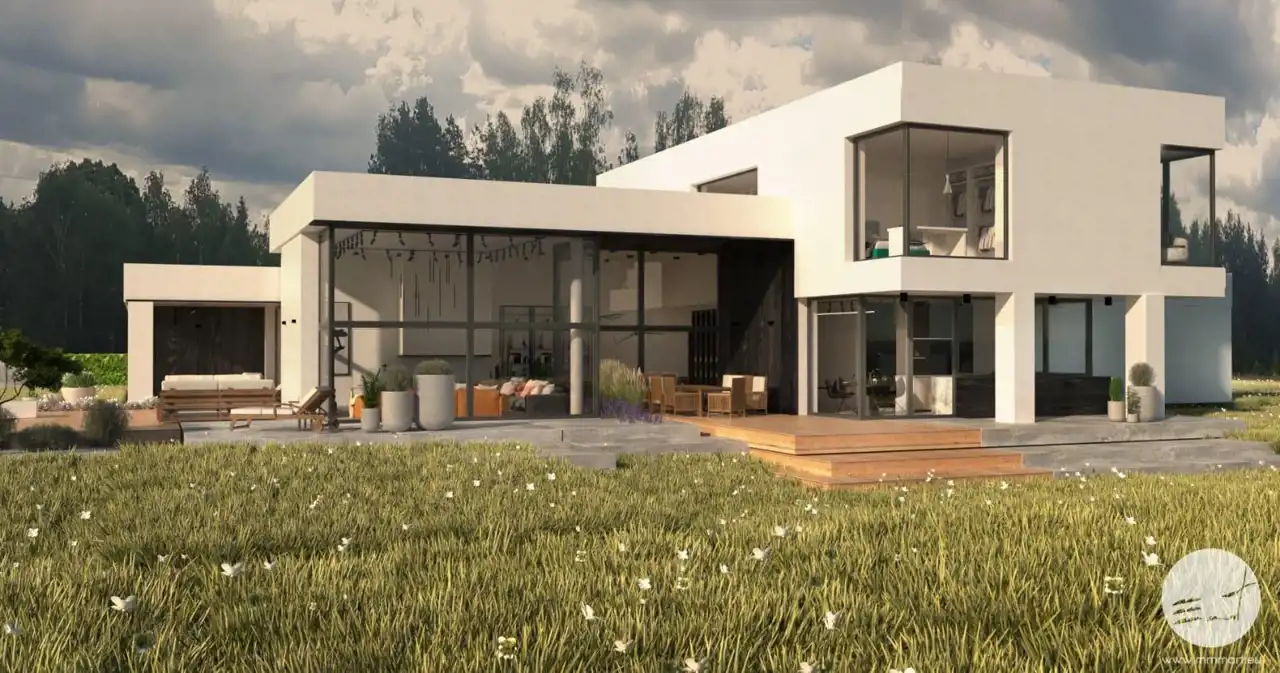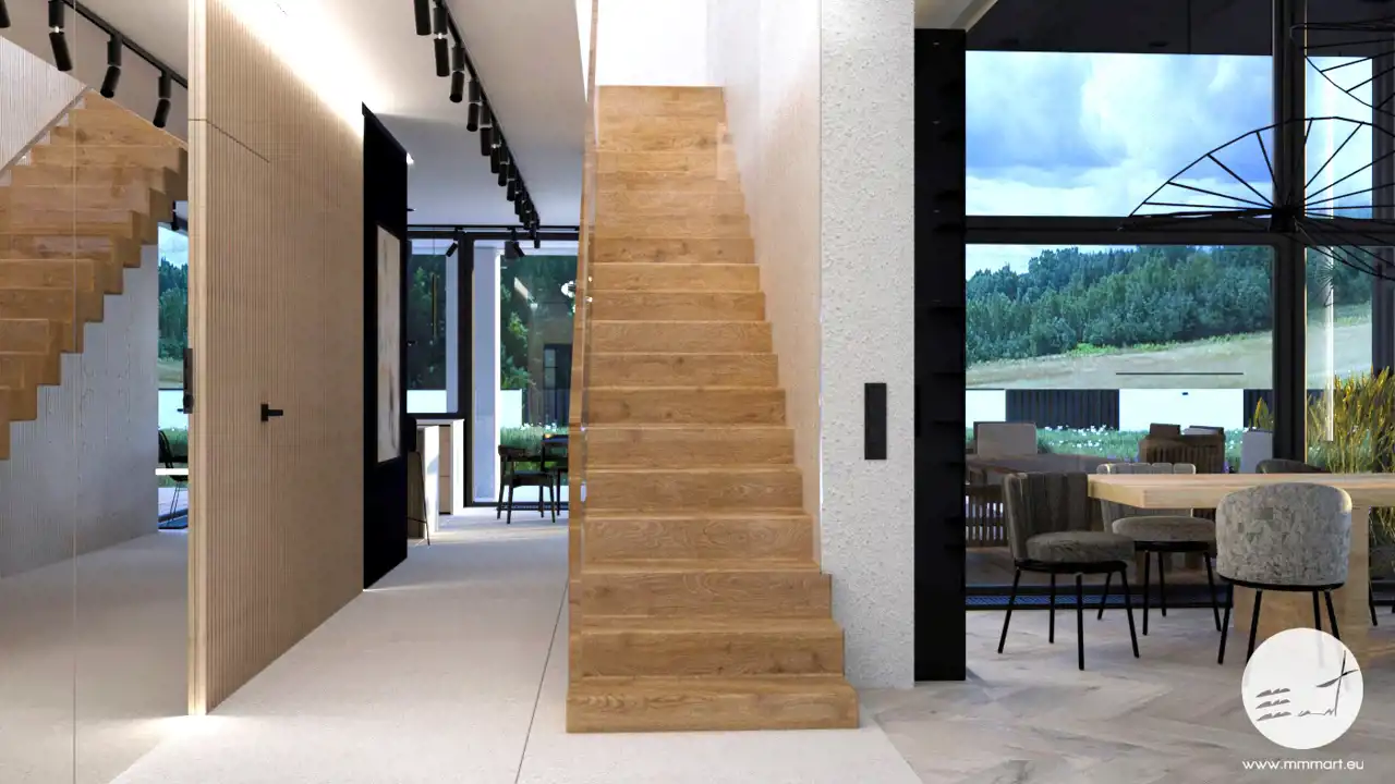 Do projektu domu zostały przygotowane profesjonalne wizualizacje wnętrz oraz elewacji, które przedstawiają możliwe wykończenie budynku w nowoczesnym stylu.