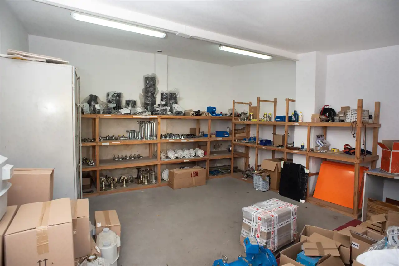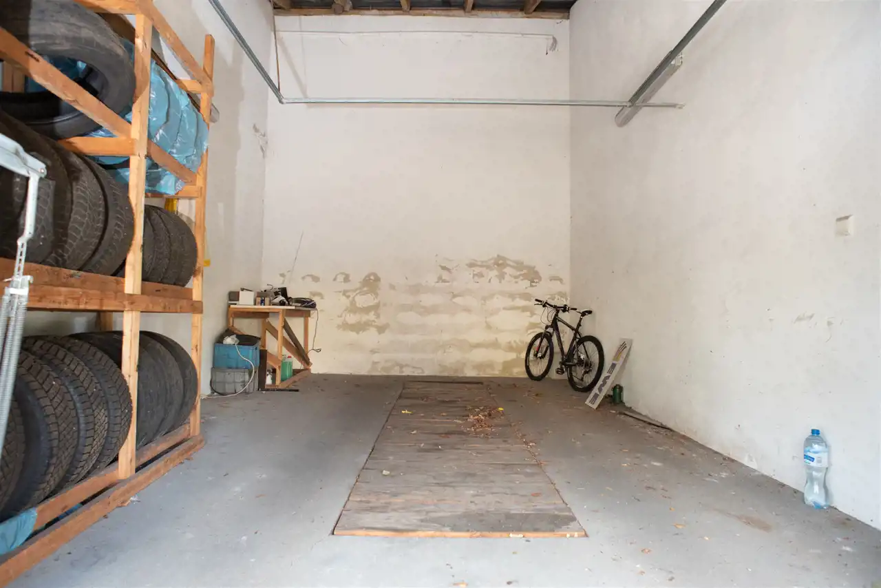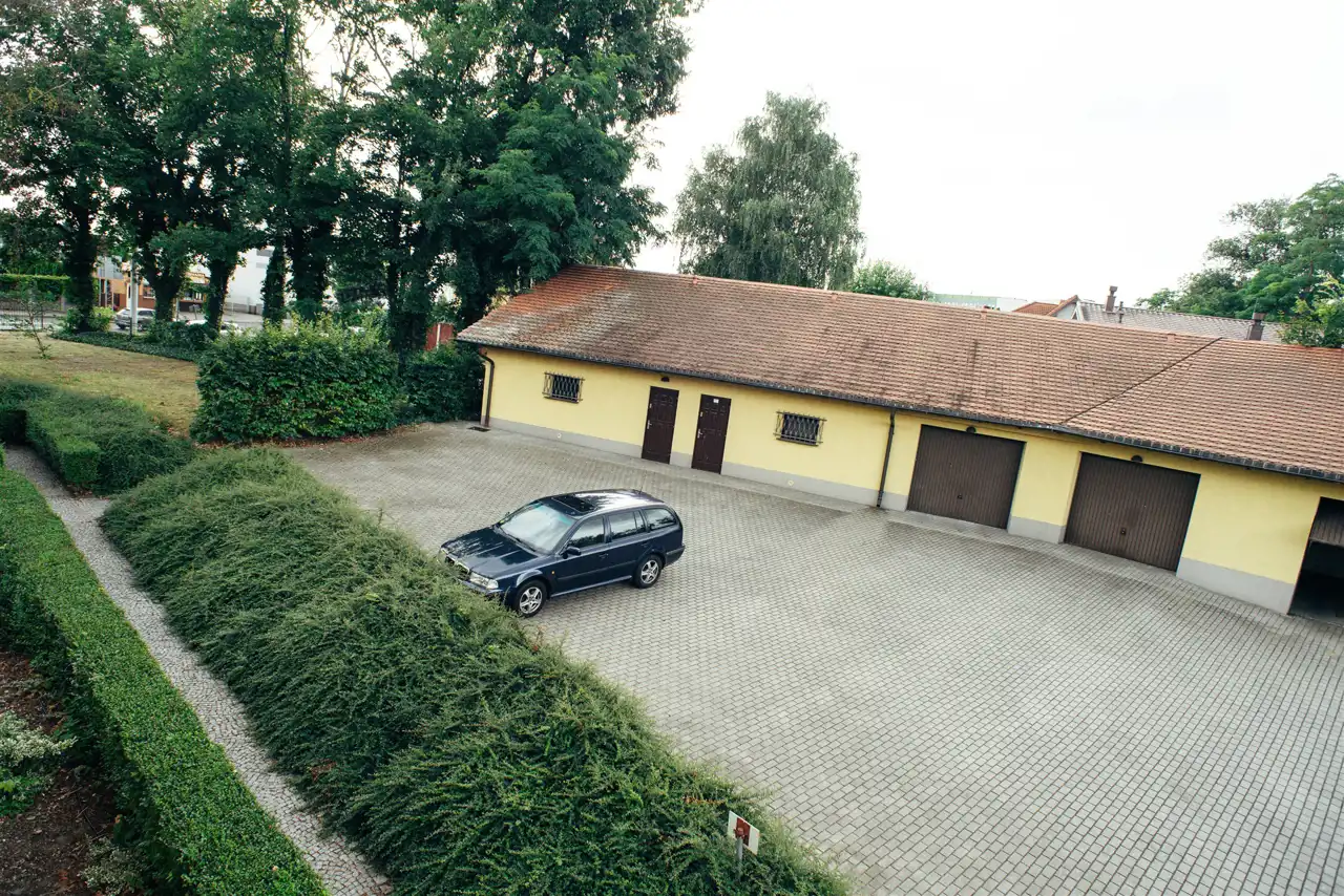 Budynek garażowo - gospodarczy. Murowany, otynkowany, parterowy, wolnostojacy, niepodpiwniczony. Na powierzchnię budynku składa się sześć boksów garażowych oraz dwa pomieszczenia gospodarcze. Dach o konstrukcji drewnianej, dwuspadowy kryty dachówką ceramiczną karpiówką. Posadzki betonowe. Boksy zamykane bramami garażowymi.