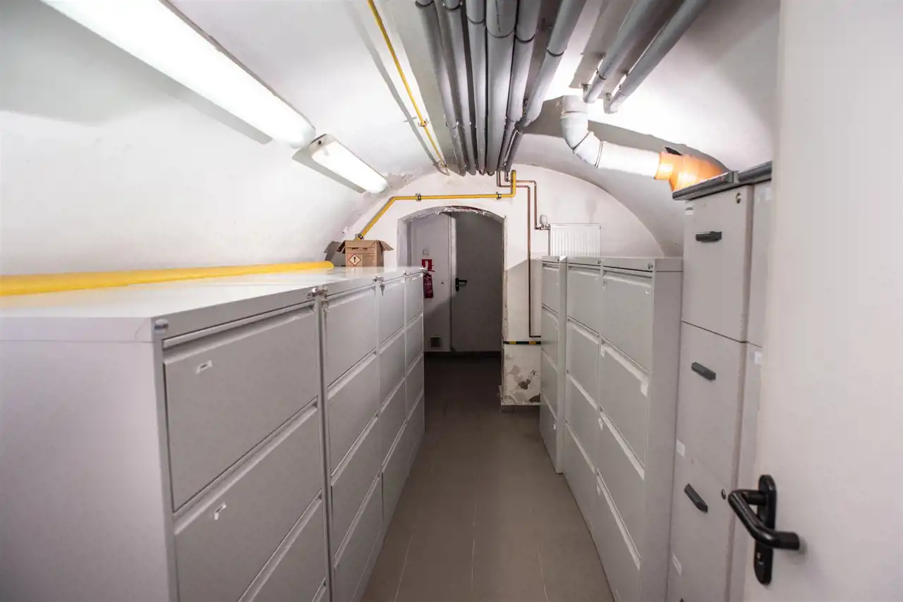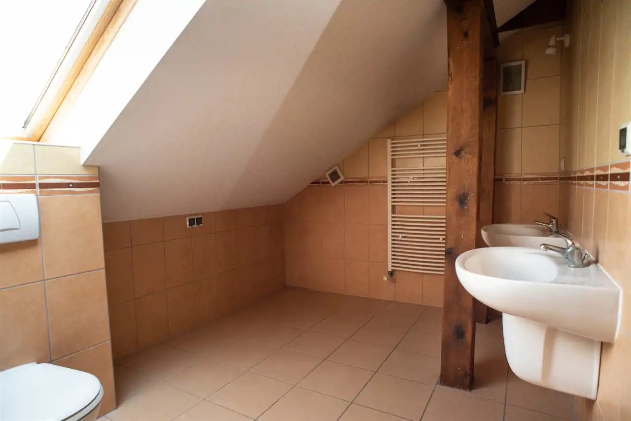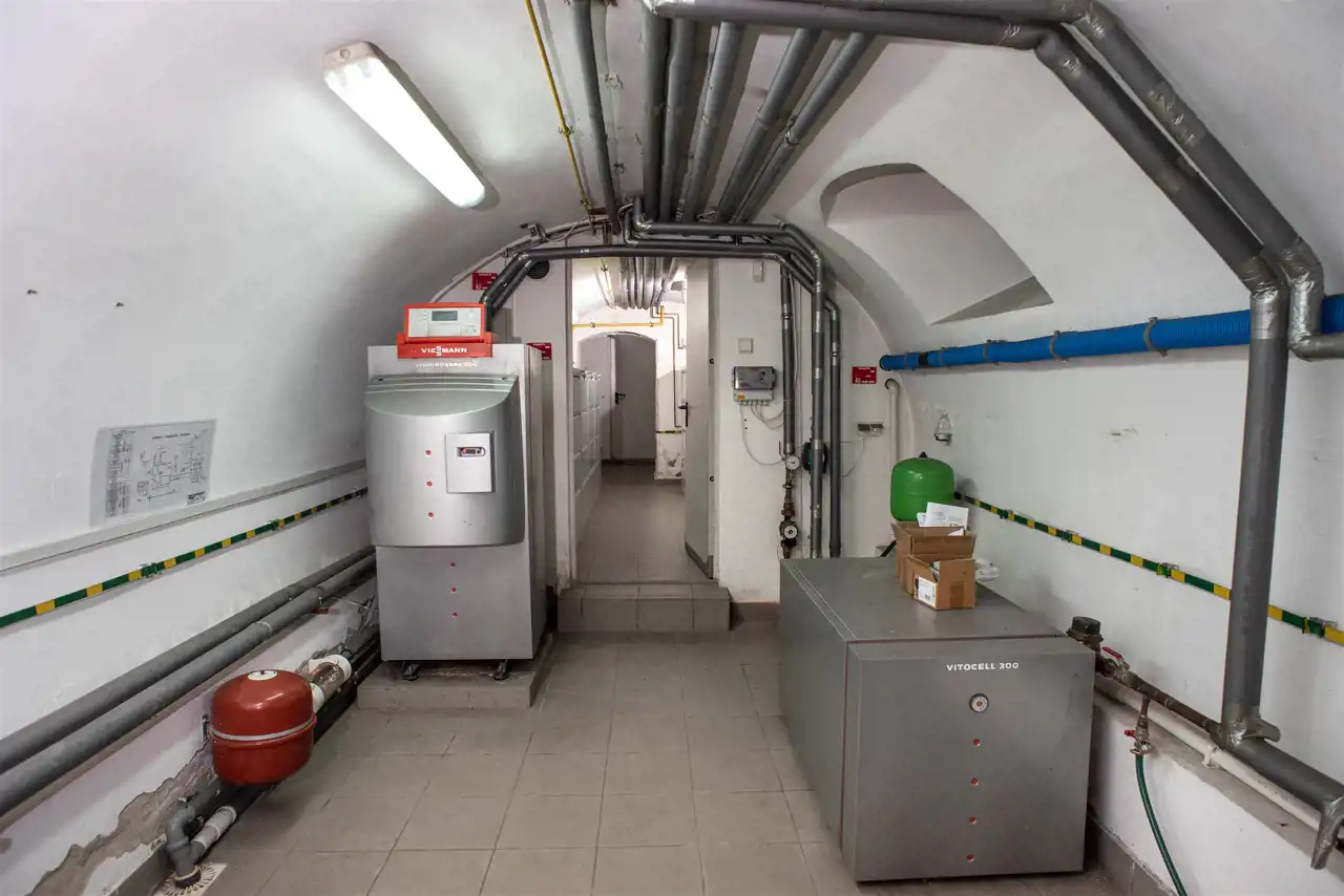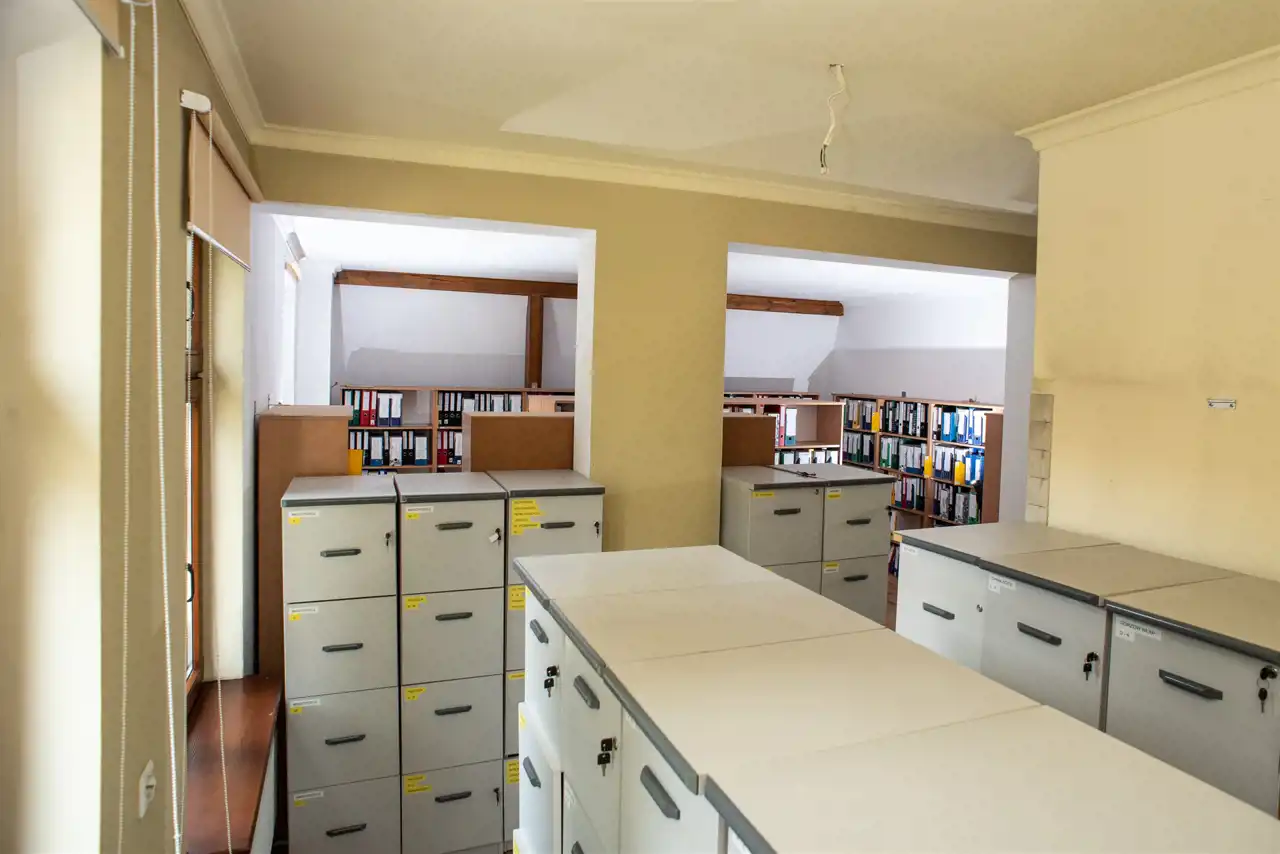 Budynek garażowo - gospodarczy. Murowany, otynkowany, parterowy, wolnostojacy, niepodpiwniczony. Na powierzchnię budynku składa się sześć boksów garażowych oraz dwa pomieszczenia gospodarcze. Dach o konstrukcji drewnianej, dwuspadowy kryty dachówką ceramiczną karpiówką. Posadzki betonowe. Boksy zamykane bramami garażowymi.