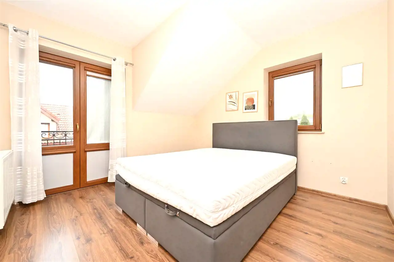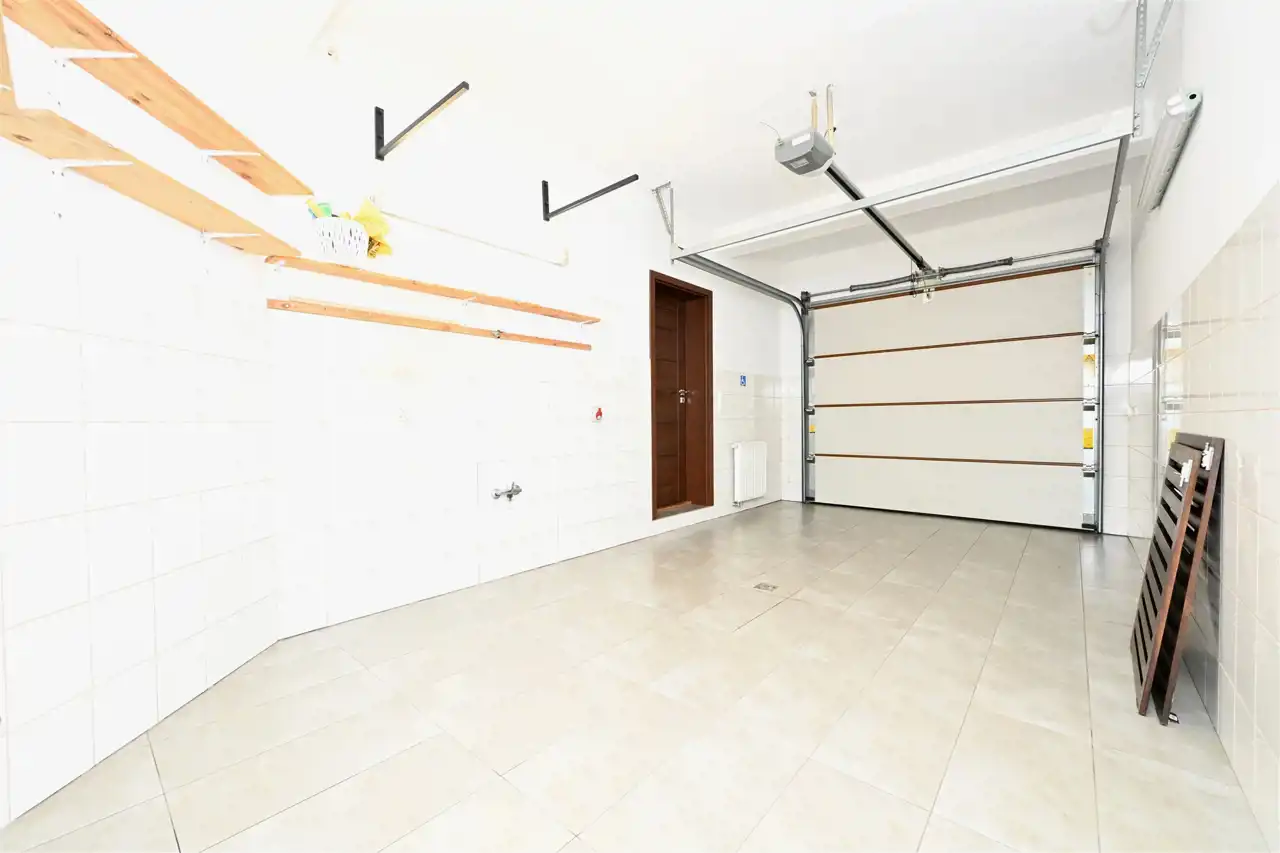 Na zewnątrz znajduje się taras z dużym ogrodem, a na podjeździe można komfortowo zaparkować dwa dodatkowe samochody.