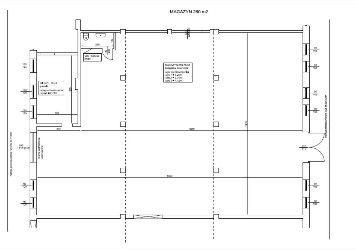 - wysokość hali do ścian bocznych 3,2m- sufit nie jest na jednej wysokości,