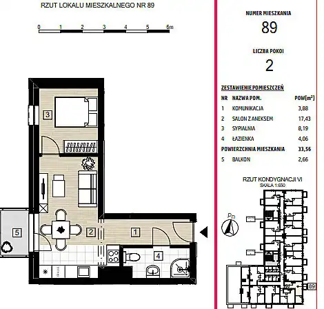 - Charakterystyka mieszkania 33.56 m2, 2 pokoje