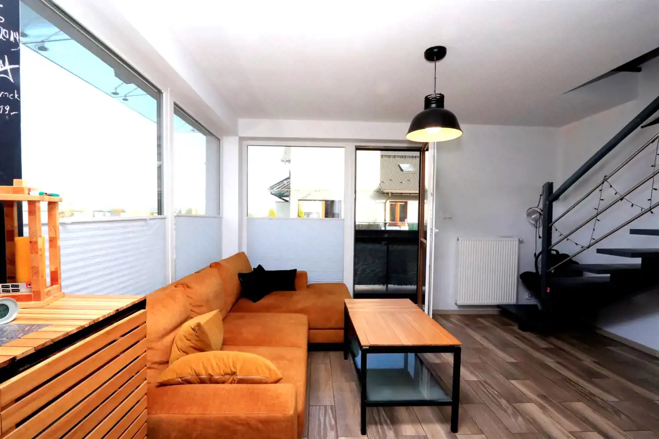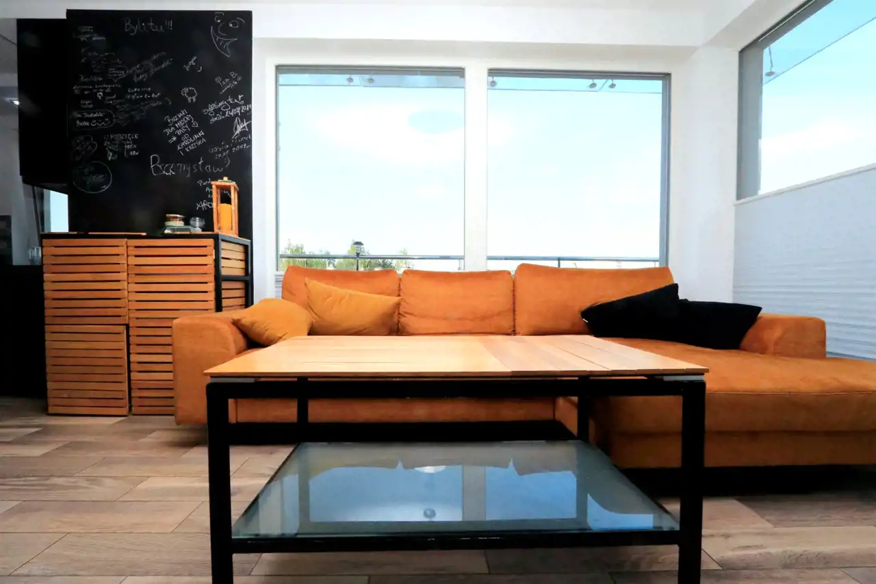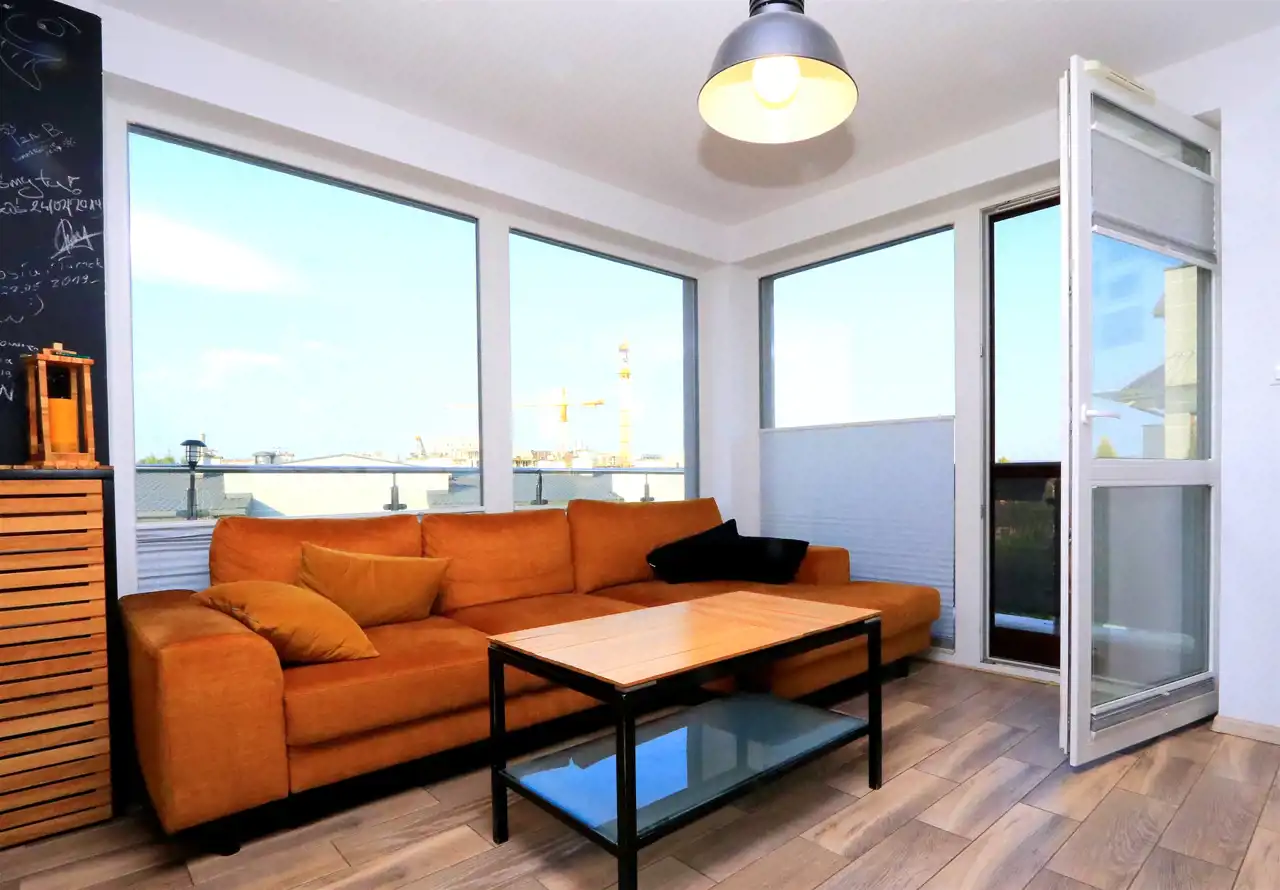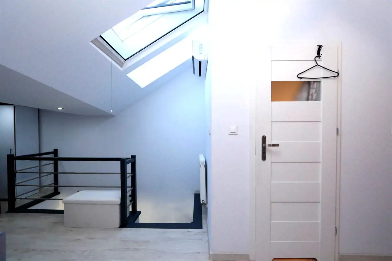 Salon z aneksem kuchennym posiada wyjście na duży narożny balkon okalający mieszkanie. Duże przeszklenia powiększają przestrzeń i dobrze doświetlają. Schody prowadzące na antresole są idealnie przemyślane, nie są strome. Mieszkanie jest wyposażone w klimatyzację. Na poddaszu mamy fajnie zagospodarowaną przestrzeń wypoczynkową, miejsce na biurko. Garderoba została zabudowana, ma około 3 metry. W łazience jest toaleta, pralka oraz umywalka.