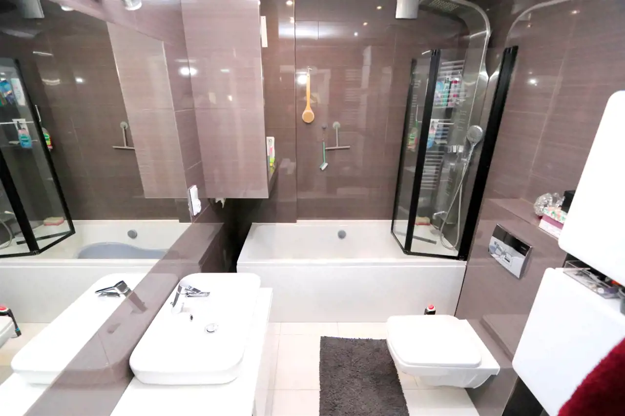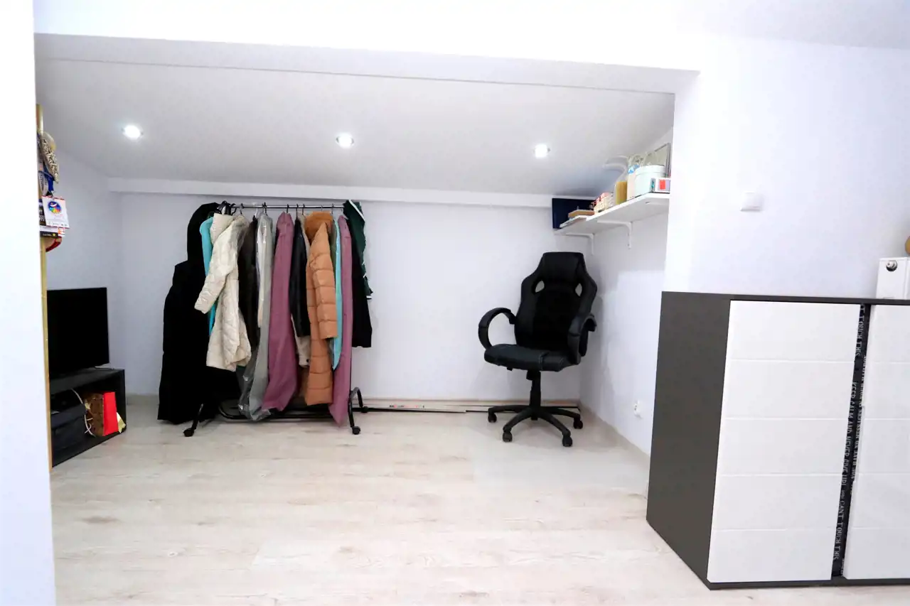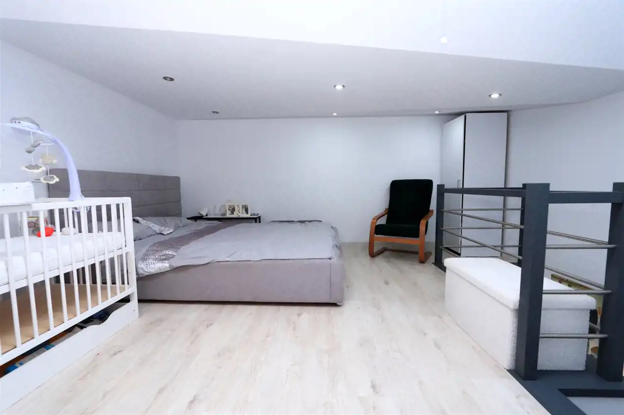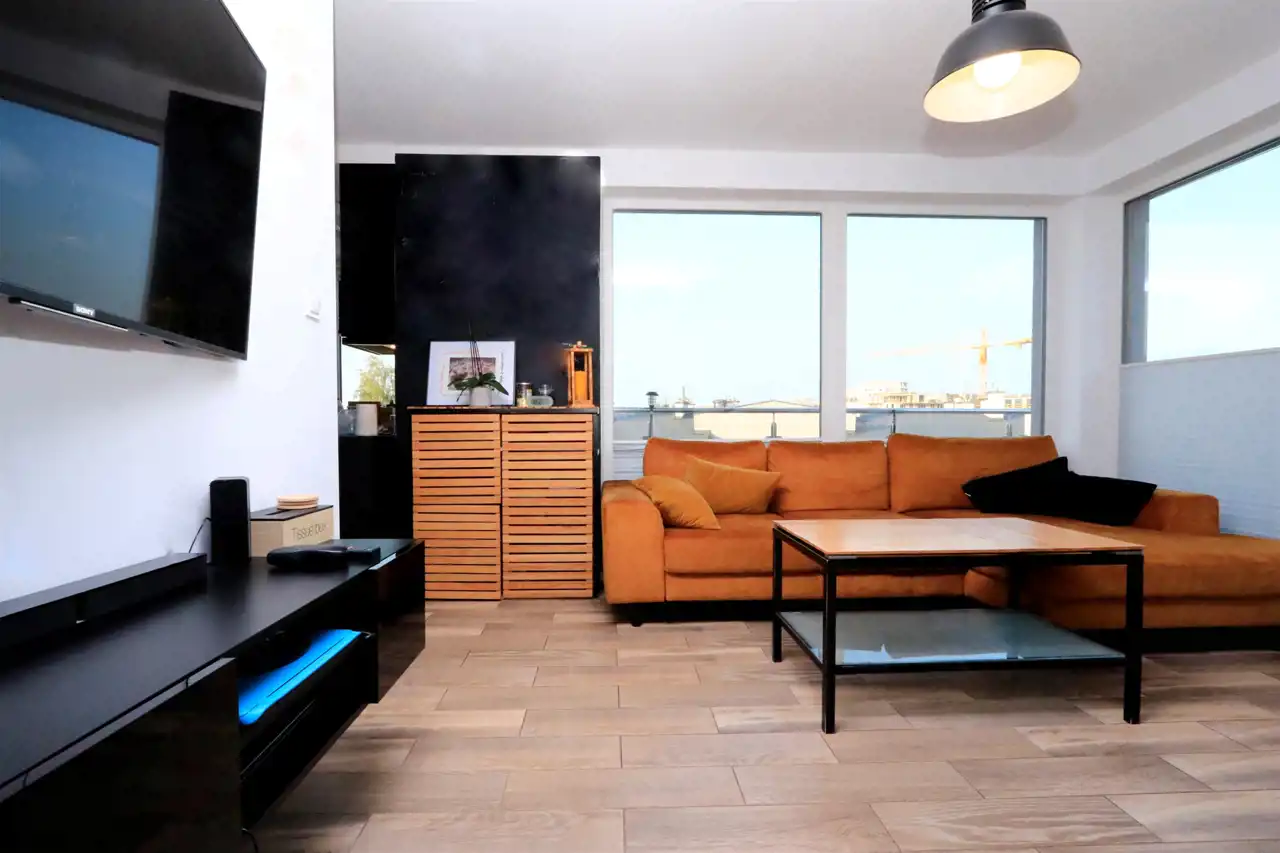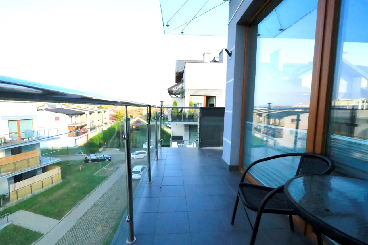 Salon z aneksem kuchennym posiada wyjście na duży narożny balkon okalający mieszkanie. Duże przeszklenia powiększają przestrzeń i dobrze doświetlają. Schody prowadzące na antresole są idealnie przemyślane, nie są strome. Mieszkanie jest wyposażone w klimatyzację. Na poddaszu mamy fajnie zagospodarowaną przestrzeń wypoczynkową, miejsce na biurko. Garderoba została zabudowana, ma około 3 metry. W łazience jest toaleta, pralka oraz umywalka.