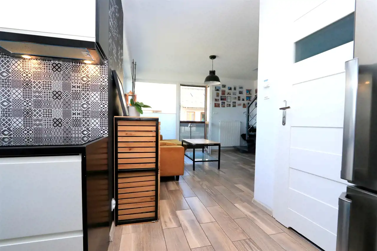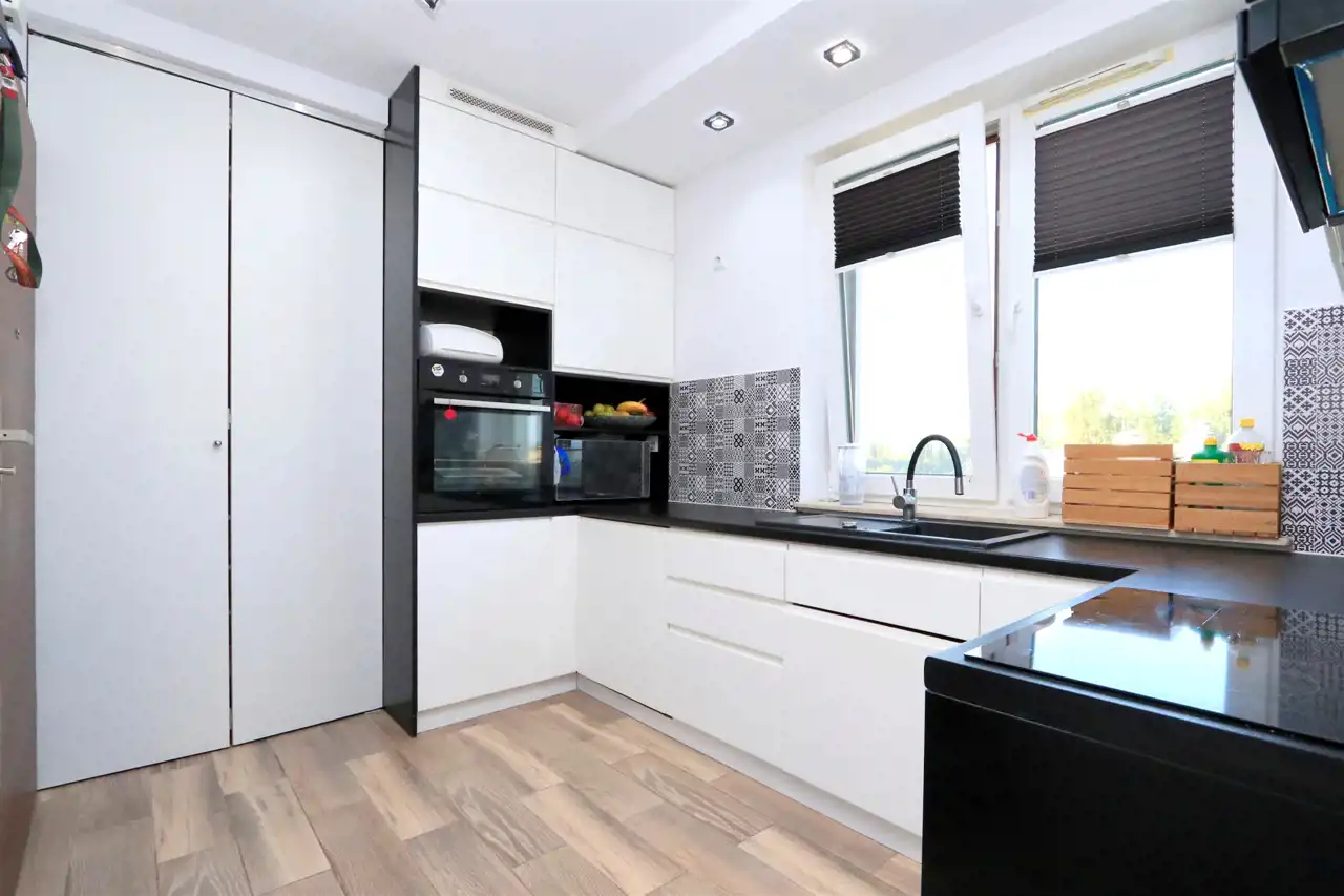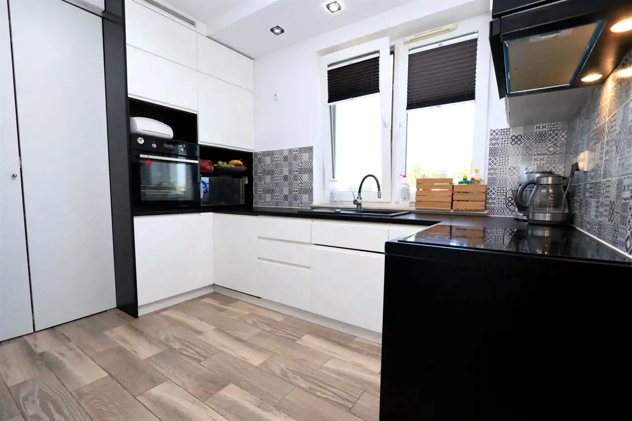 Na stosunkowo małej przestrzeni udało się idealnie rozplanować przytulną przestrzeń. W kuchni jest klasyczna biało czarna zabudowa z zabudowaniami we wnękach. Oczywiście mamy kuchnie indukcyjną, piekarnik i zmywarkę. W salonie zmieścił się duży, wygodny, musztardowy narożnik. Mieszkanie sprzedawane jest z całym wyposażeniem na parterze natomiast meble z poddasza są do ustalenia.