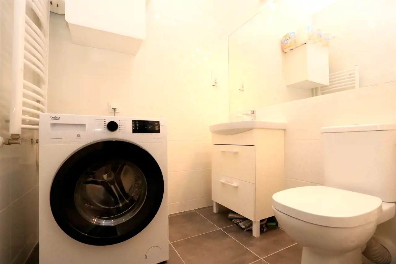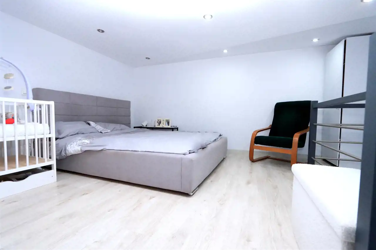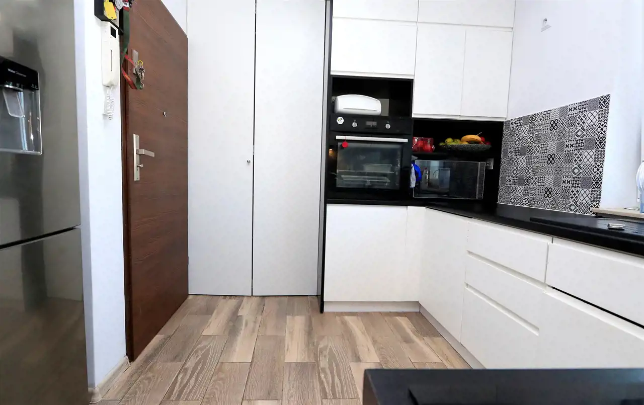 Na stosunkowo małej przestrzeni udało się idealnie rozplanować przytulną przestrzeń. W kuchni jest klasyczna biało czarna zabudowa z zabudowaniami we wnękach. Oczywiście mamy kuchnie indukcyjną, piekarnik i zmywarkę. W salonie zmieścił się duży, wygodny, musztardowy narożnik. Mieszkanie sprzedawane jest z całym wyposażeniem na parterze natomiast meble z poddasza są do ustalenia.