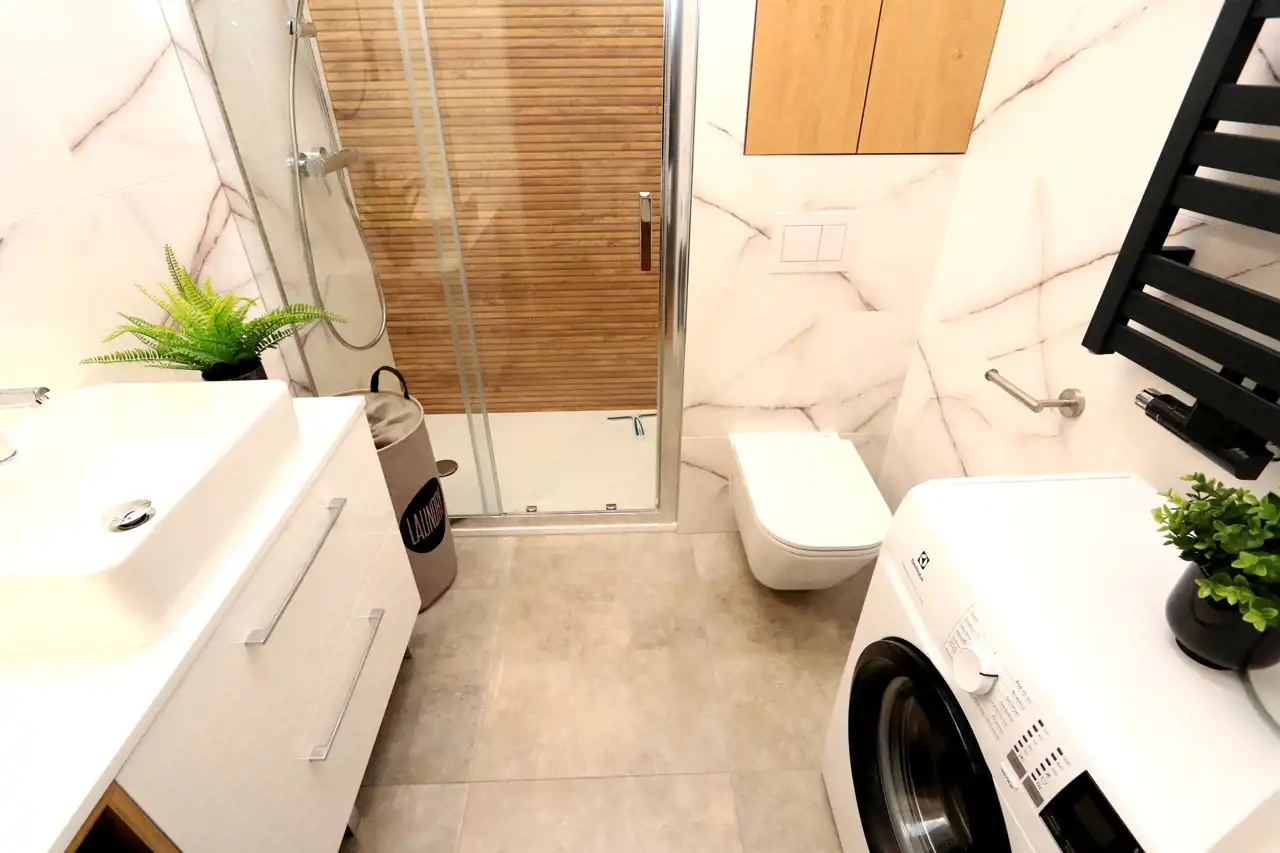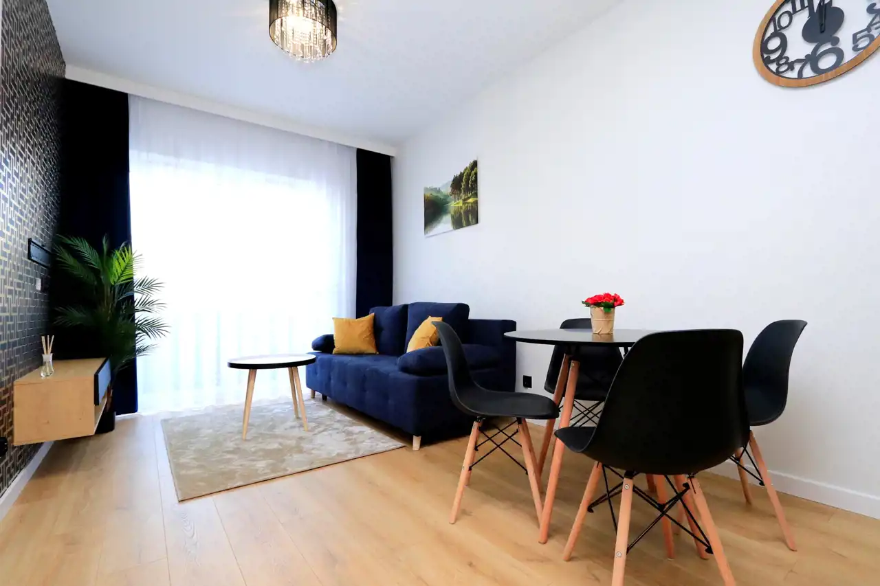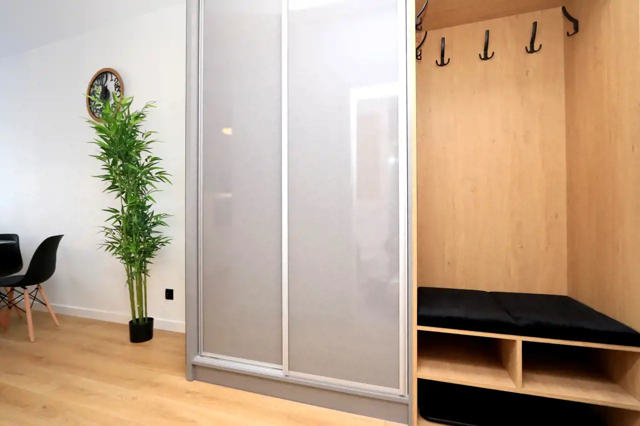 Mieszkanie jest w pełni umeblowane i wyposażone w niezbędne sprzęty AGD. Salon z aneksem kuchennym jest jasny i funkcjonalny, a w przedpokoju znajduje się duża, pojemna szafa. Ogrzewanie oraz ciepła woda z sieci miejskiej.