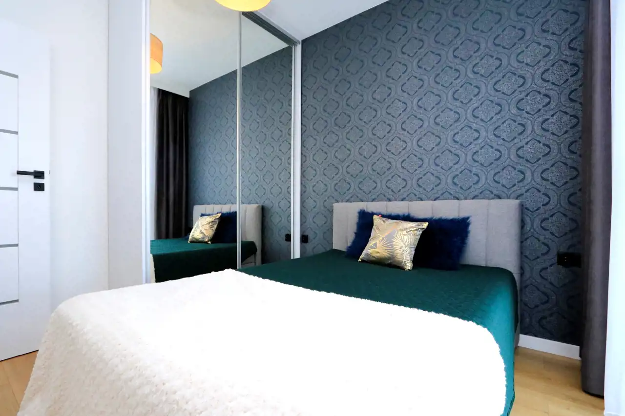 Mieszkanie o powierzchni 34,15 m² znajduje się na 2. piętrze nowoczesnego budynku. Składa się z salonu z aneksem kuchennym, sypialni, łazienki oraz przedpokoju.